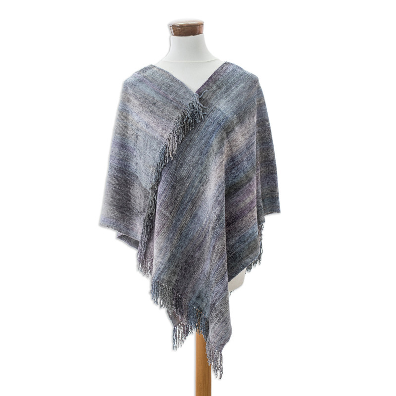 Backed by our 100% Happiness GuaranteeA palette of lavender, sky blue and laurel hues adds a refined aura to this charming creation handwoven by artisans of the K'amolon K'i K'ojonel Association from Guatemala. Using cotton and rayon made from bamboo, they transform a traditional design into a fashionable poncho embellished with fringes for a unique look.