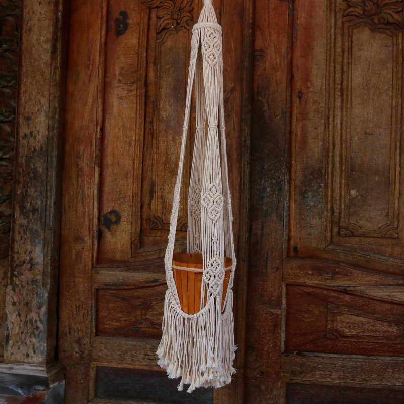 Crafted by hand of cotton in a natural vanilla tone, this flower pot hanger from Bali is by Elis Mufarroha. With lovely macramé openwork, it features a space for holding a flower pot from 8 to 16 inches in diameter.