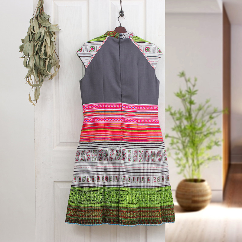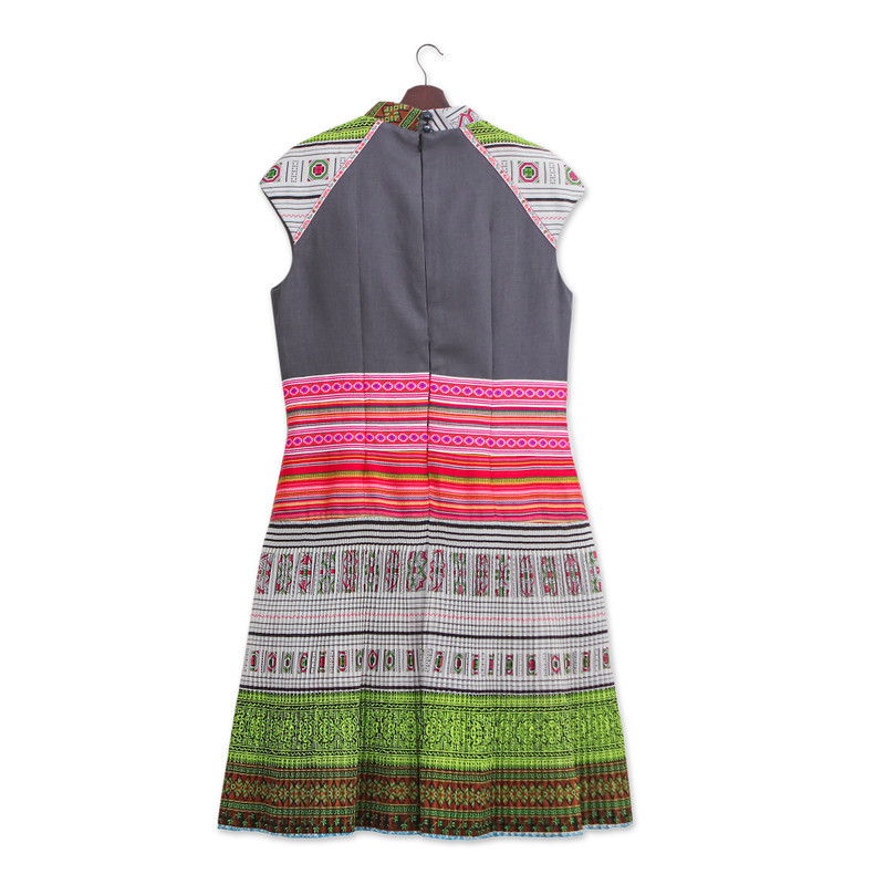 Backed by our 100% Happiness GuaranteeWith traditional Hmong textiles and motifs adorning its short sleeves, crew neckline and pleated skirt, this enchanting sheath dress by Thai artisan Chattima projects timeless beauty. Made from a cotton and hemp blend in a sophisticated grey hue, the top features a colourful rayon panel just below that adds to its allure. Skillfully crafted through a combination of cross-stitch and printed techniques, floral and geometric patterns infuse the dress with undeniable charm. Fully lined and captivating, this must-have garment is finished with a hidden back zippered closure and nape buttons for a tailored fit that ensures style and comfort.