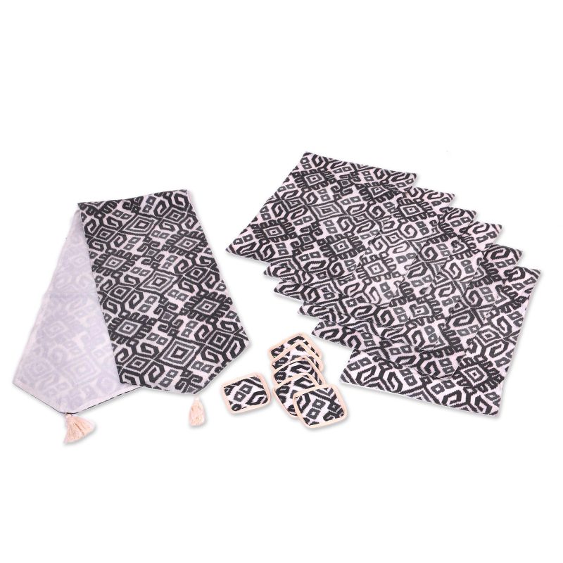 Featuring exotic geometric diamond patterns in stone over a body of snow white, this 13-piece table linen set from Java is designed by Hari Ratih. Each item in this set is woven of cotton in the ikat style, where the individual threads are tie-dyed before being woven into their predetermined pattern. This set includes a table runner with tassels on the ends, six placemats, and six coasters.