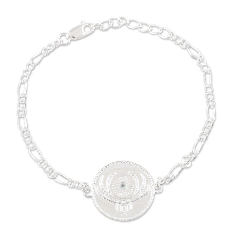Backed by our 100% Happiness GuaranteeBlue topaz centers a chakra motif in sterling silver. This beautiful unity bracelet from Alok Jain celebrates our sameness in diversity. "The Ashok chakra, or 'wheel of duty' has 24 spokes that represent the 24 religious paths of humanity, and all lead a nation on path of progress," he explains. Six sprigs of rice flank the wheel. "Rice is part of India's a cultural identity and also symbolizes global unity, as almost half of the population on this earth eats rice."