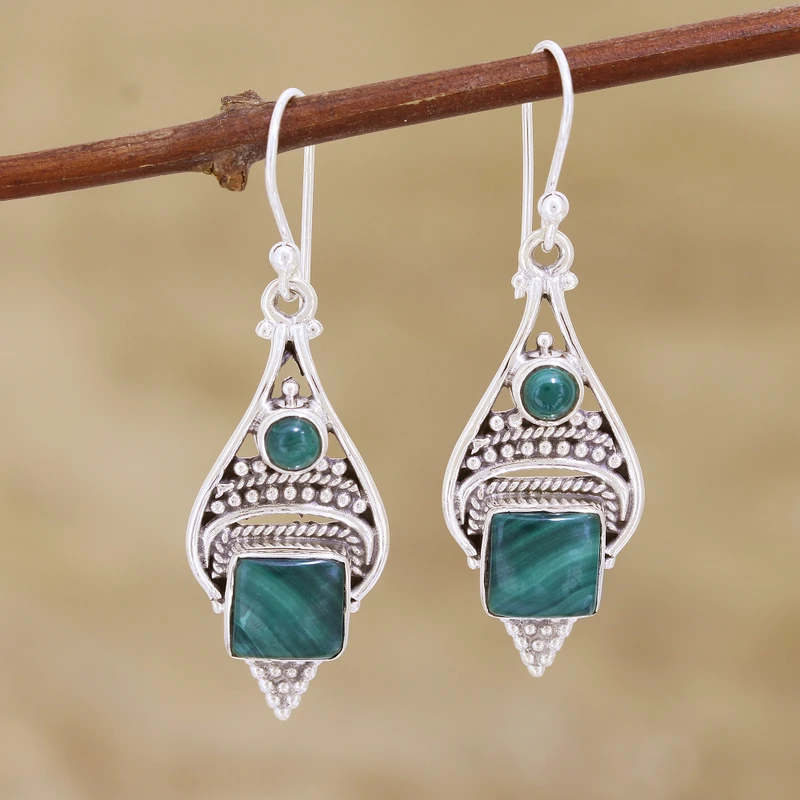 Considered to be a stone of transformation, malachite heals on physical and emotional levels, drawing out impurities and stimulating the Life Force within each of us. These intricate dangle earrings from Neeru Goel of India start with tiny droplets of sterling silver above small, round malachite cabochons. The design gives way to an intricate pattern of silver roping and balls before culminating in square, bezel-set malachite cabochons.