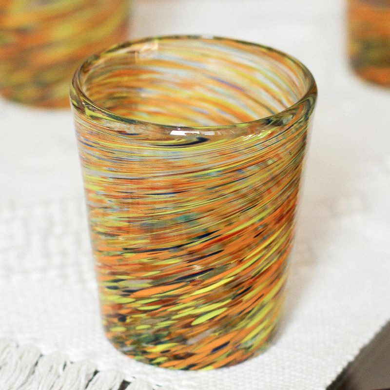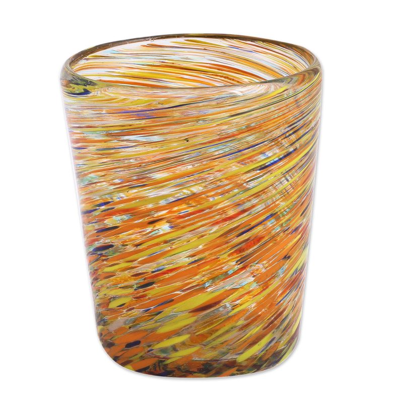 Mexican craftsmen orchestrate a multicolored centrifugal illusion of for these multicolor glasses for drinks on the rocks. Created for the Novica Handblown Collection, each one is crafted with traditional blown glass techniques, in which master artisans blow through a metal pipe while twirling it with one hand. They simultaneously shape the molten glass at the other end, expertly achieving a colorful effect.