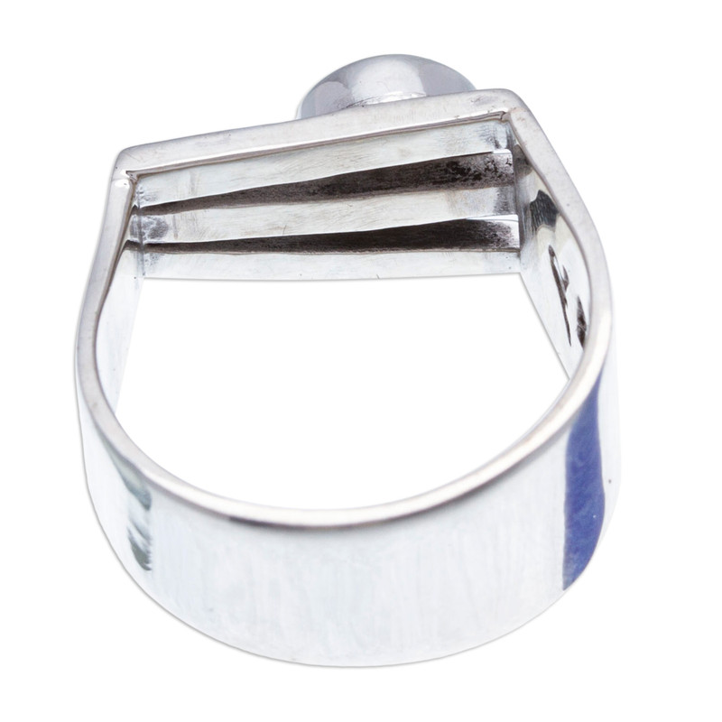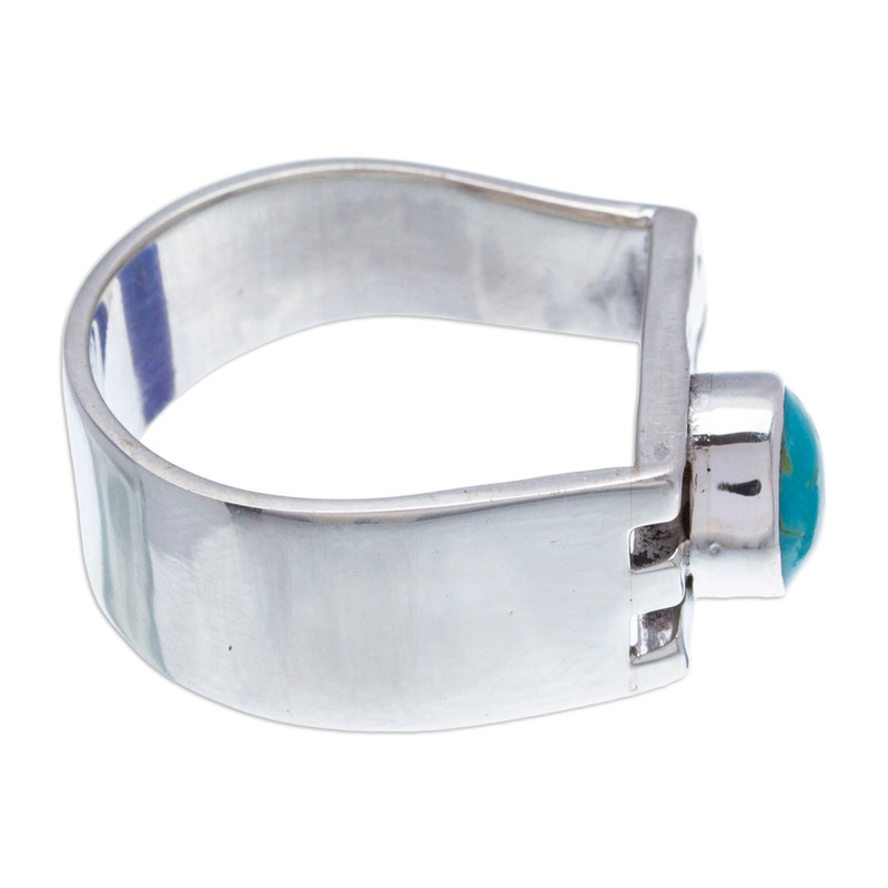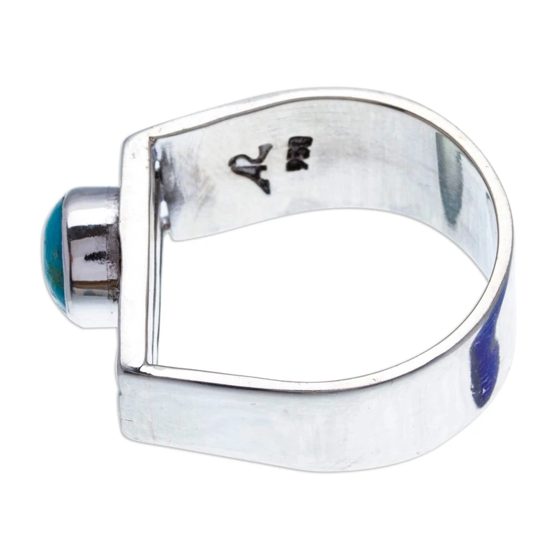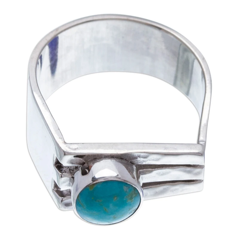Backed by our 100% Happiness GuaranteeIn the enchanting tradition of Mexico's famed Taxco silver, Alon Diller crafts a spellbinding cocktail ring of modern allure. Embracing the finger with elegance, the wide band of 950 silver shines radiantly while the front evokes the graceful curves of a harp, adorned with delicate hammered accents. At the heart of this contemporary masterpiece rests a mesmerizing turquoise gem whose natural beauty captivates and dazzles.