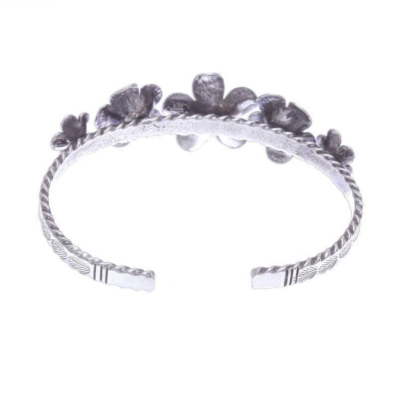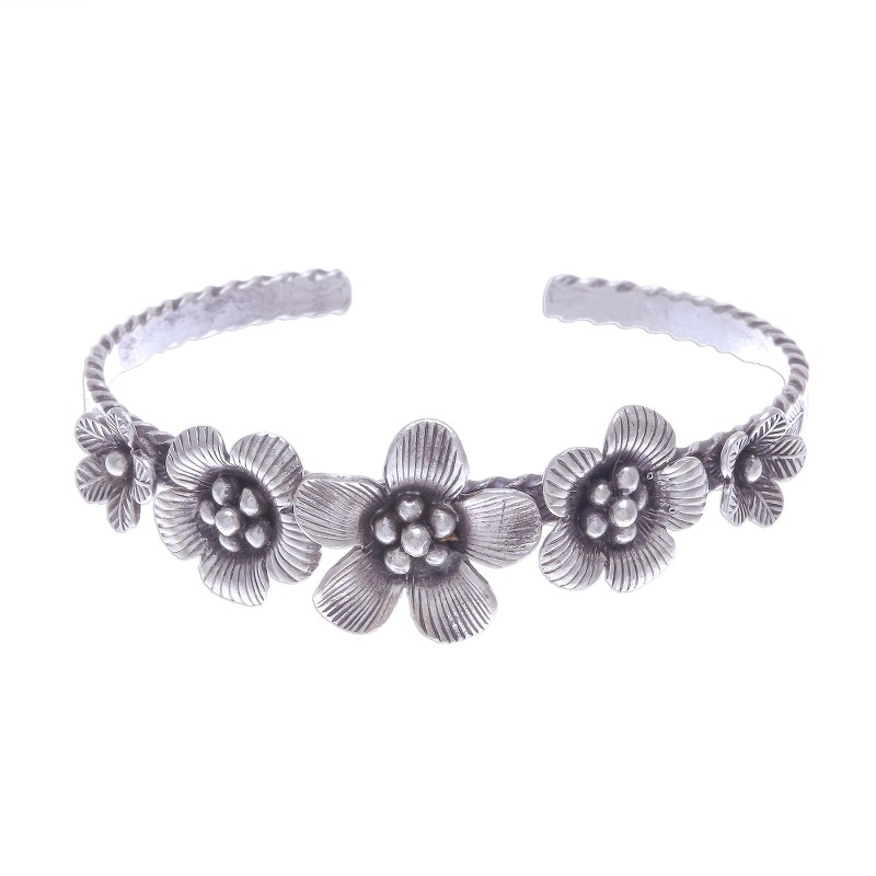 Backed by our 100% Happiness GuaranteeThis handcrafted silver bracelet from Thailand's Pakaon Sojintarit features five delicate blossoms engraved with fine detail, then oxidized to heighten the design. Crafted from Karen 950 silver, the cuff bracelet features a fluted edge and stamped leaves for interest from any angle.