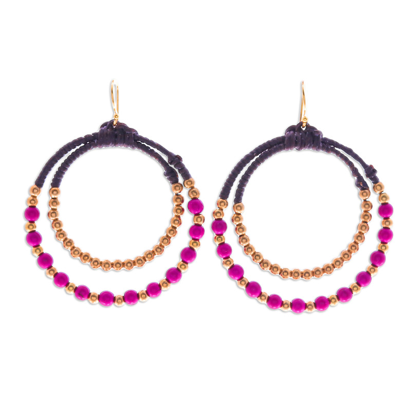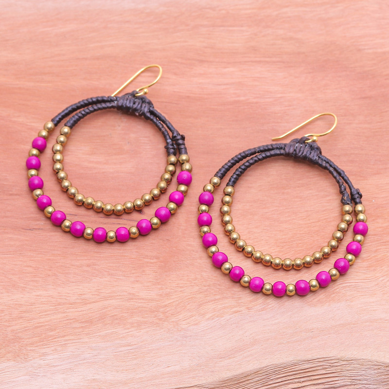 Glamor and cultural heritage make a perfect combination thanks to Thai artisan Tiraphan Hasub, who meticulously handcrafts a magnificent accessory that will imbue your style with unparalleled vibrancy. These alluring dangle earrings showcase double hoops adorned with intricate brass beads and gorgeous magenta magnesite stones held together by waxed cords. The spectacular earrings are gracefully finished with gold-plated sterling silver hooks, ensuring ease of wear and an additional dose of elegance and radiance.
