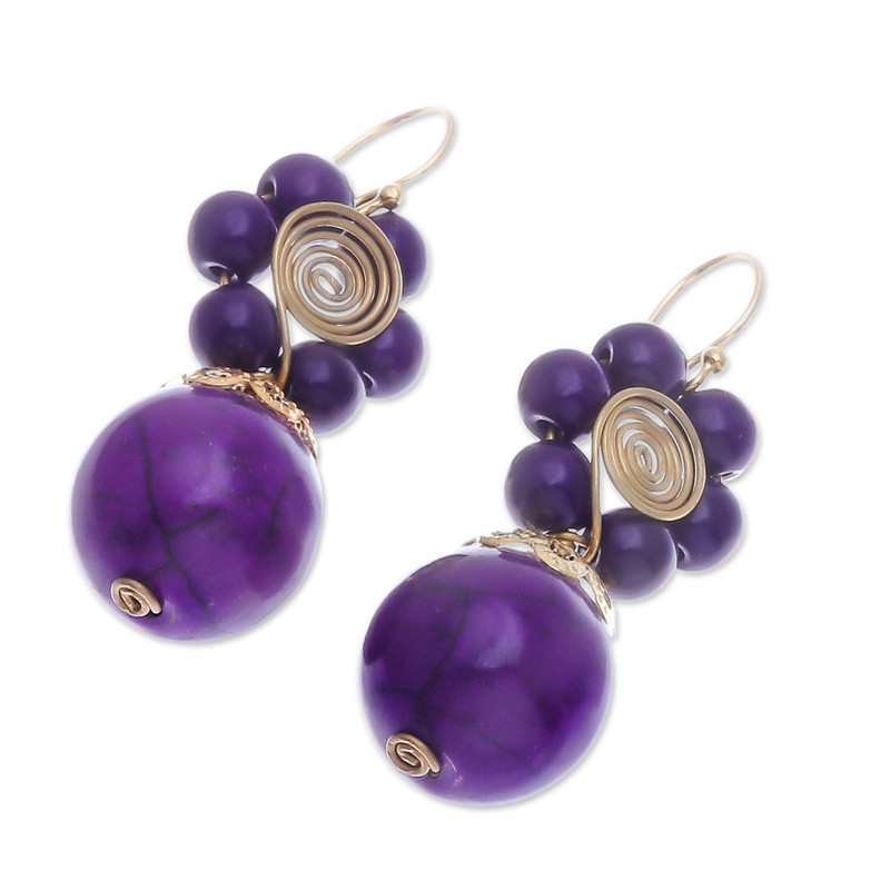 Backed by our 100% Happiness GuaranteeThai artisan Tiraphan Hasub draws inspiration from the delicate charm of flowers for these captivating dangle earrings where magnificent magnesite stones in a stunning purple shade steal the spotlight. The stylish accessories feature intricate spiral accents created with precision through the expert manipulation of brass wire and are further enhanced with gold-plated sterling silver hooks, imparting an extra layer of refinement and luminosity.