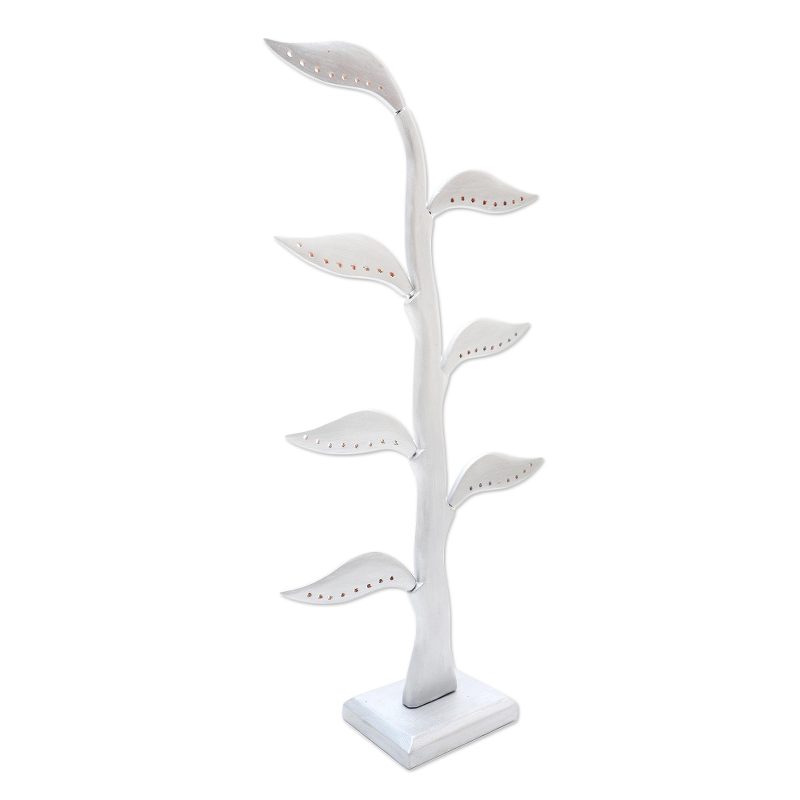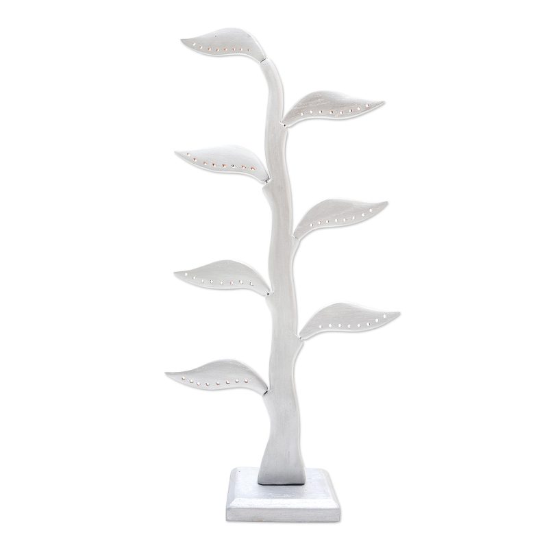 Organize your life with this lovely earring holder in the shape of a graceful branch in metallic silver tone. Hand crafted from jempinis wood, this tall jewelry stand is perfect for a large collection of earrings; it boasts seven waving leaves that hold four pairs of earrings each. Artisan Yudi Suardi calls this piece Daun Salam, an Indonesian phrase that means "bay leaf." Please note the leaves and base are packaged separately for safe shipping.