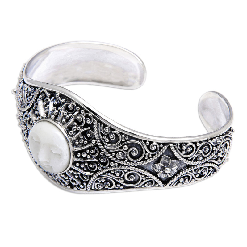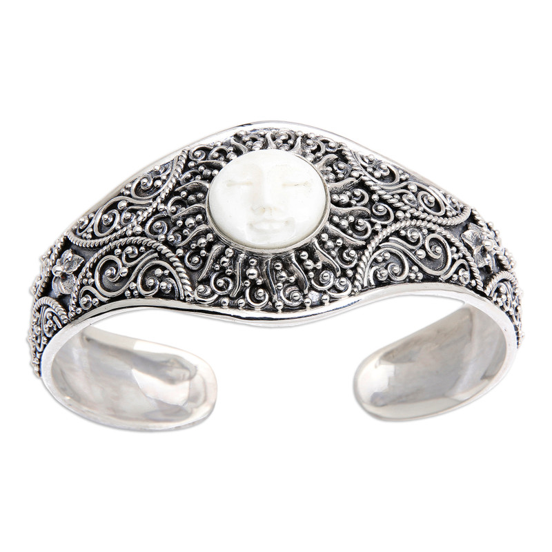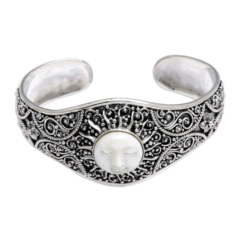 Transform your ensemble effortlessly with artisan Buana's charming cuff bracelet featuring a captivating sun motif. The design is meticulously carved from natural bone and nestled within a sterling silver setting showcasing intricate accents and a harmonious fusion of oxidized and polished finishes, exuding elegance and allure.