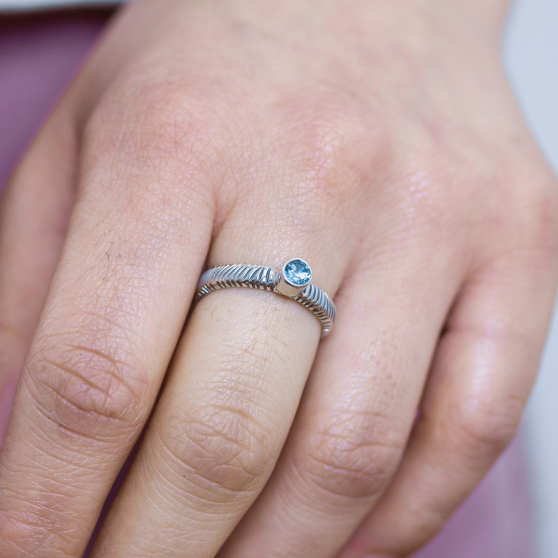 I love this ring - the topaz is a gorgeous blue. Looks great worn alone or stacked with another silver band. I also have the matching earrings which are equally beautiful. Looking for a pendant....???