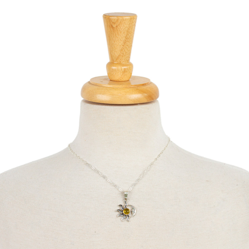 Backed by our 100% Happiness GuaranteeGlowing with the hues of the sun, a honey-colored dome of natural amber is featured in the pendant of this necklace from Mexico. Juan Garcia uses the artisanal skills that he has been developing from a young age, framing the amber with a sterling silver pendant. It depicts the sun as it moves to eclipse the crescent moon.