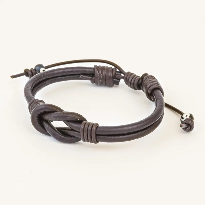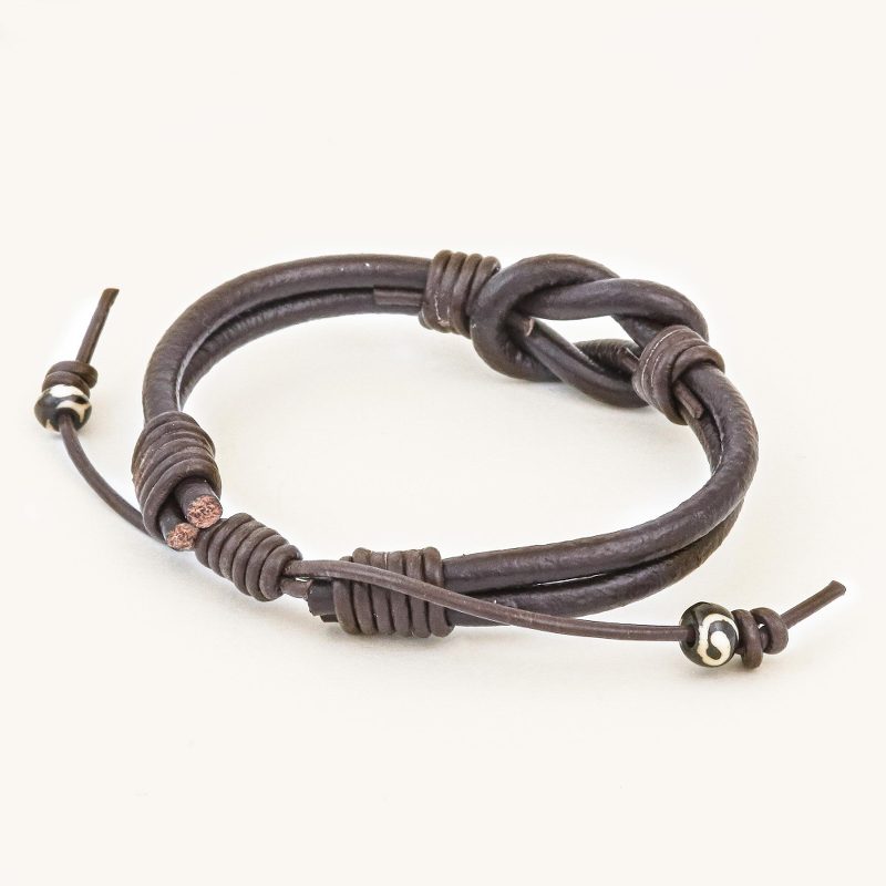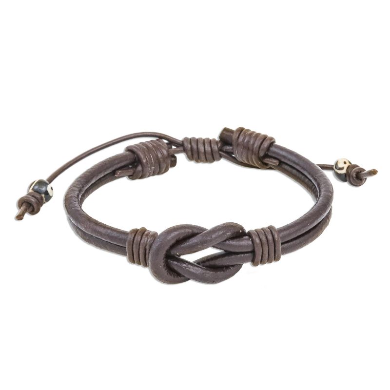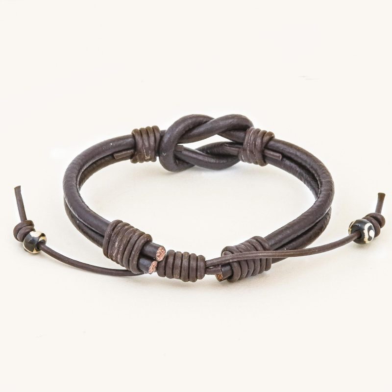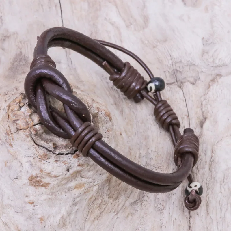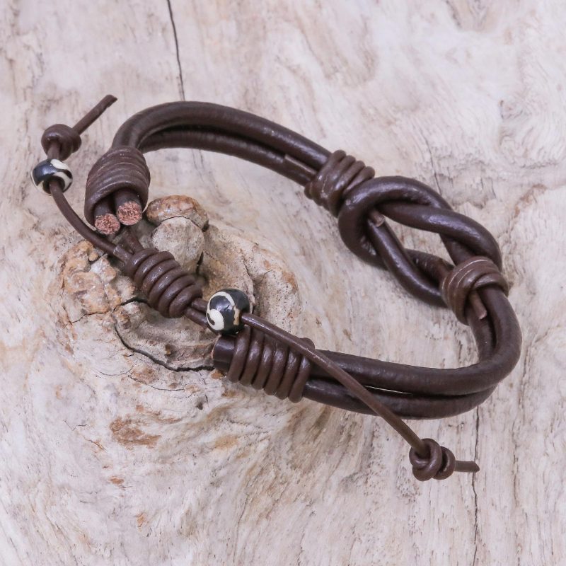 Backed by our 100% Happiness GuaranteeTwo thick cords come together in a square knot and return to their origins. Working in chocolate brown leather, Chaloemphon crafts a handsome unity bracelet. Painted bone beads adorn each end. "In every country, COVID-19 is a big problem. Let's all work in unity to wear a mask, wash our hands and practice social distancing," the Thai artisan says.