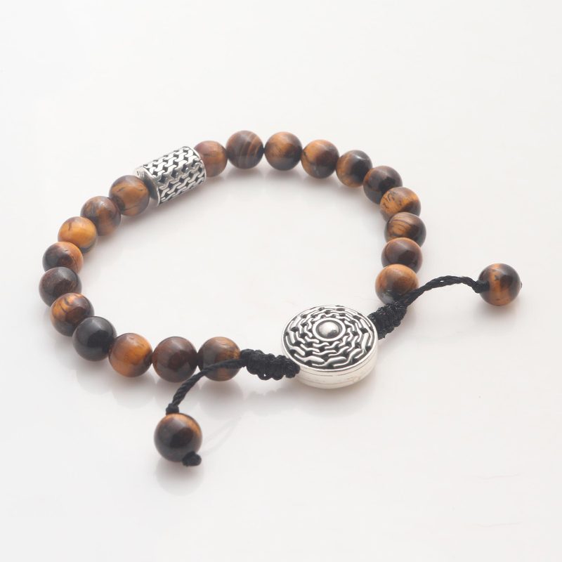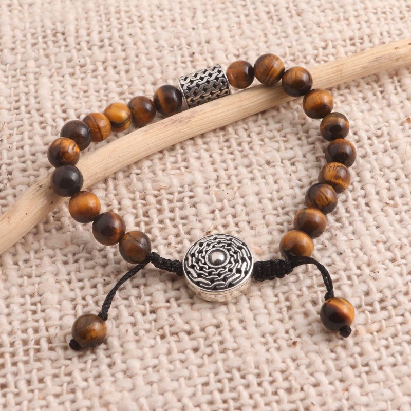 Backed by our 100% Happiness GuaranteeBy Dewa Arimbawa, glowing globes of tiger's eye bring warmth and beauty to this design. The Balinese artisan crafts a unity bracelet with sterling silver beads. Both repeat the letter S, symbolizing solidarity.