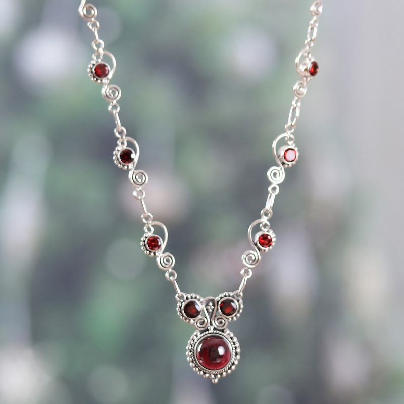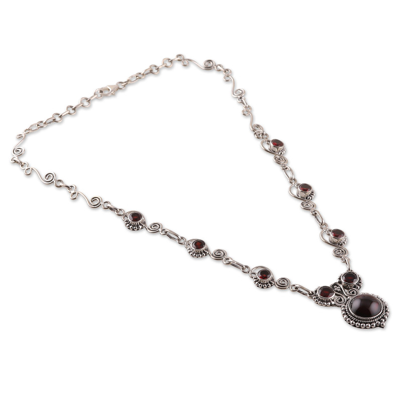 The January birthstone garnet and its sublime crimson beauty add regal grace to this necklace. Neeru Goel's accessory showcases a contemporary interpretation of India's traditional royal jewellery in each distinguished detail, crafted by local artisans with expertise in these noble arts. Set in sterling silver, natural garnet garnet jewels find the perfect place, totaling over four carats.