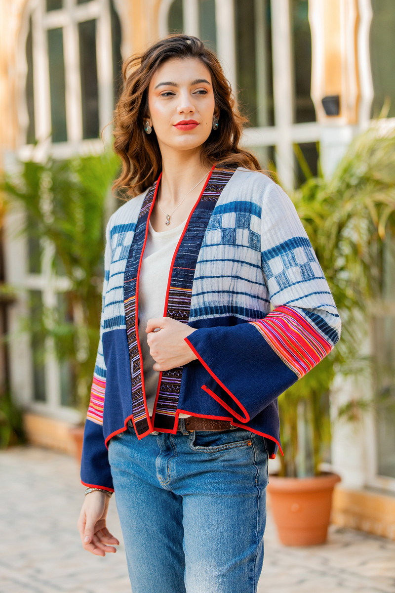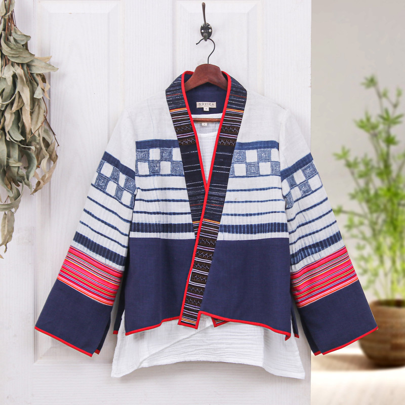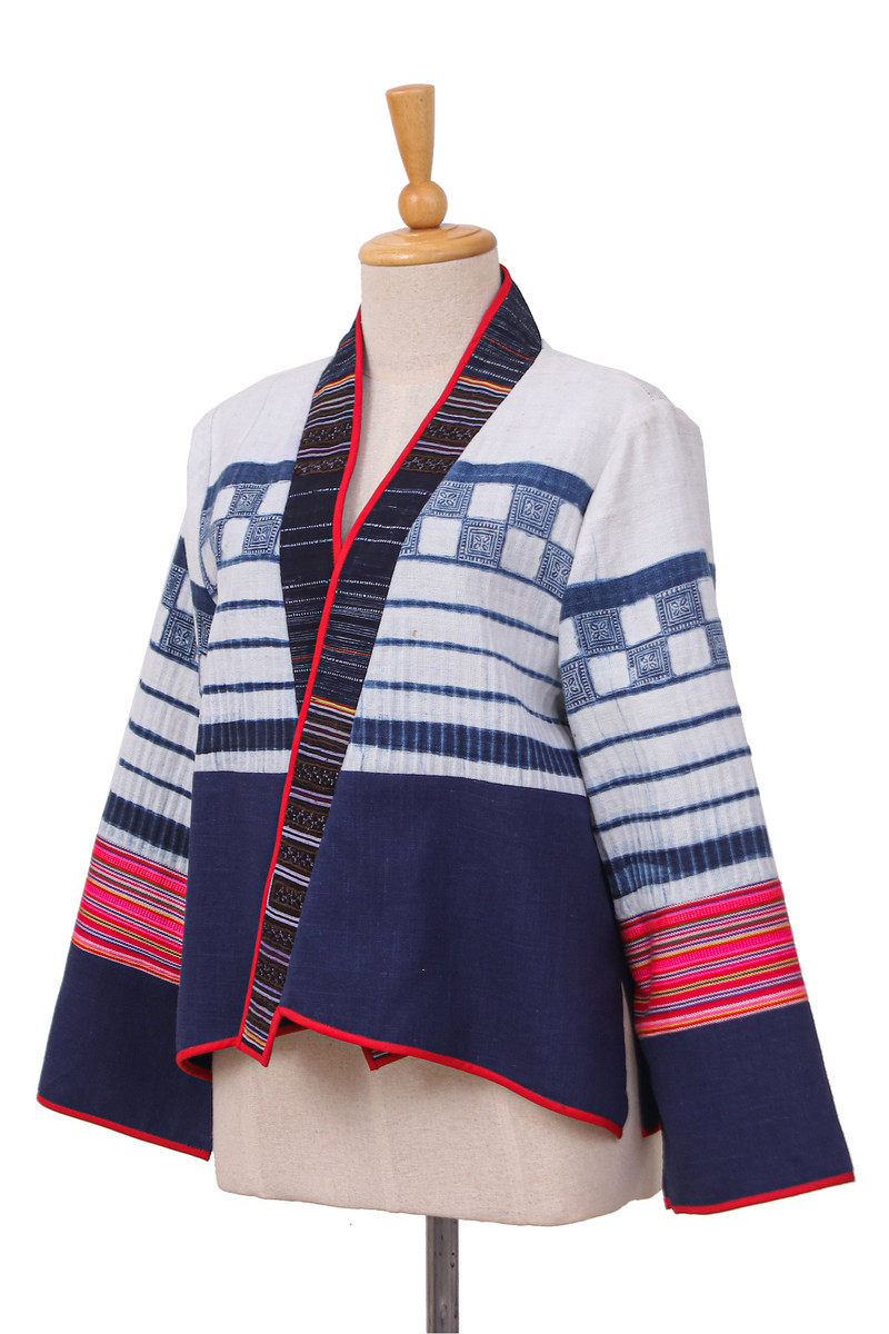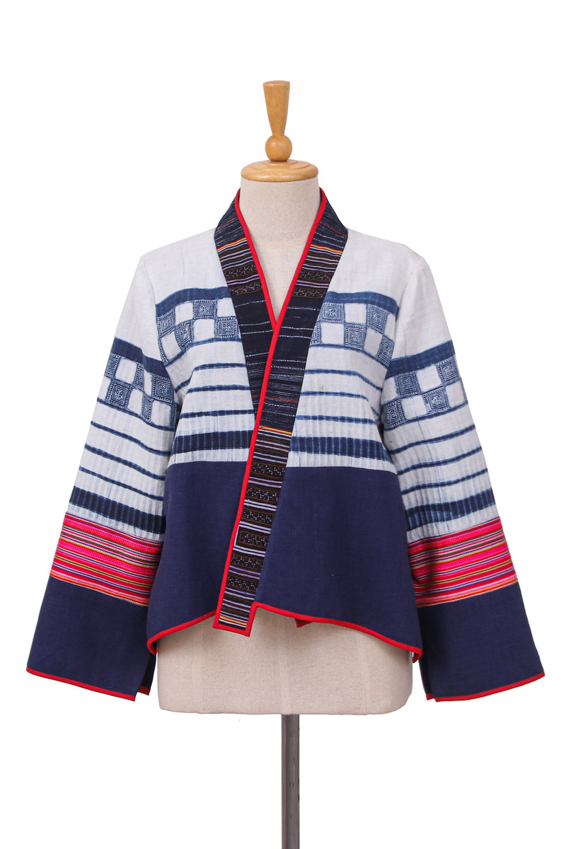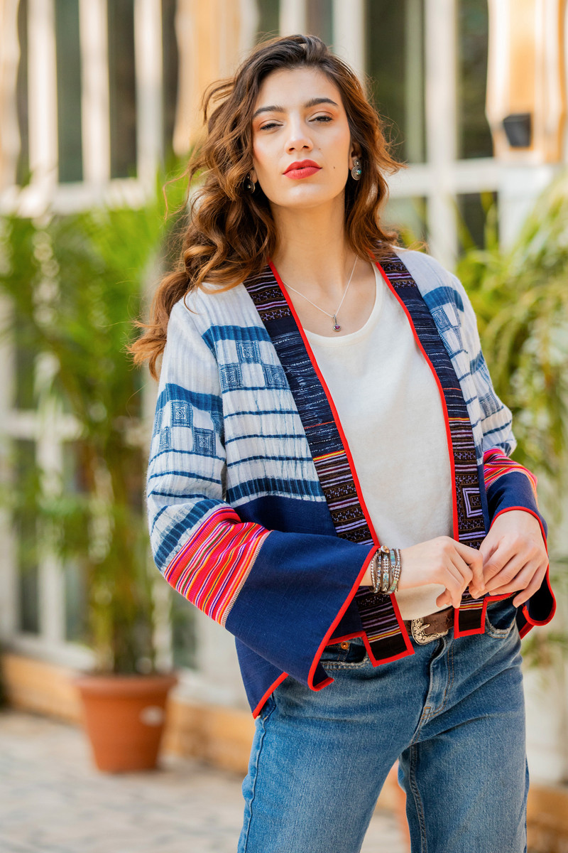 Inspired by The Hmong tribes of Southeast Asia, this gorgeous jacket showcases designer Chattima's true love of her culture and strength in design. The indigo and white fabric is sourced from vintage cotton-hemp pleated skirts traditionally worn by Hmong women. The sleeves feature striped fabric in red tones woven on the hand loom by the Karen Hill tribe. The jacket is edged with thin a red band referencing the red hand stitch details that often accent traditional costumes. This statement jacket is truely a fusion of East meets West.
