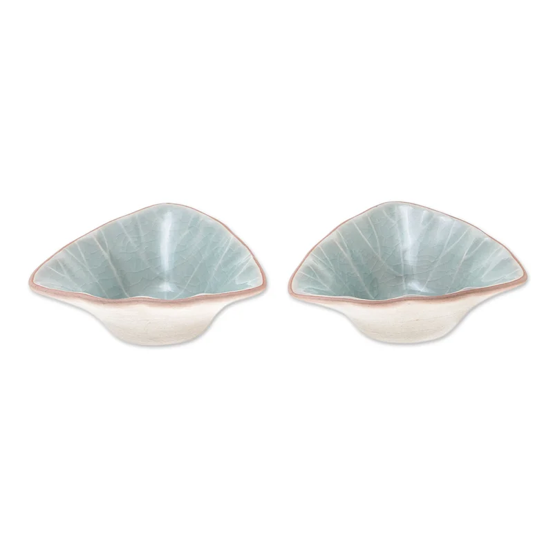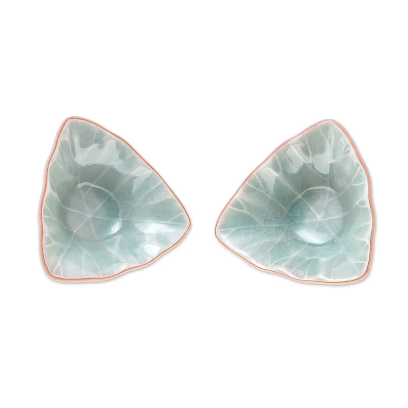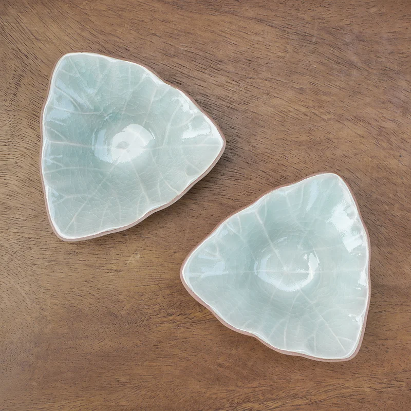 Backed by our 100% Happiness GuaranteeAdd a beautiful touch to your dinner service with this pair of triangular ceramic condiment servers. Penpan of Thailand presents these handcrafted servers glazed in celadon green on the inside and left the natural warm beige of the clay on the outside and rim. The glazed portion of the servers have leaf veining texture and a crackle finish.