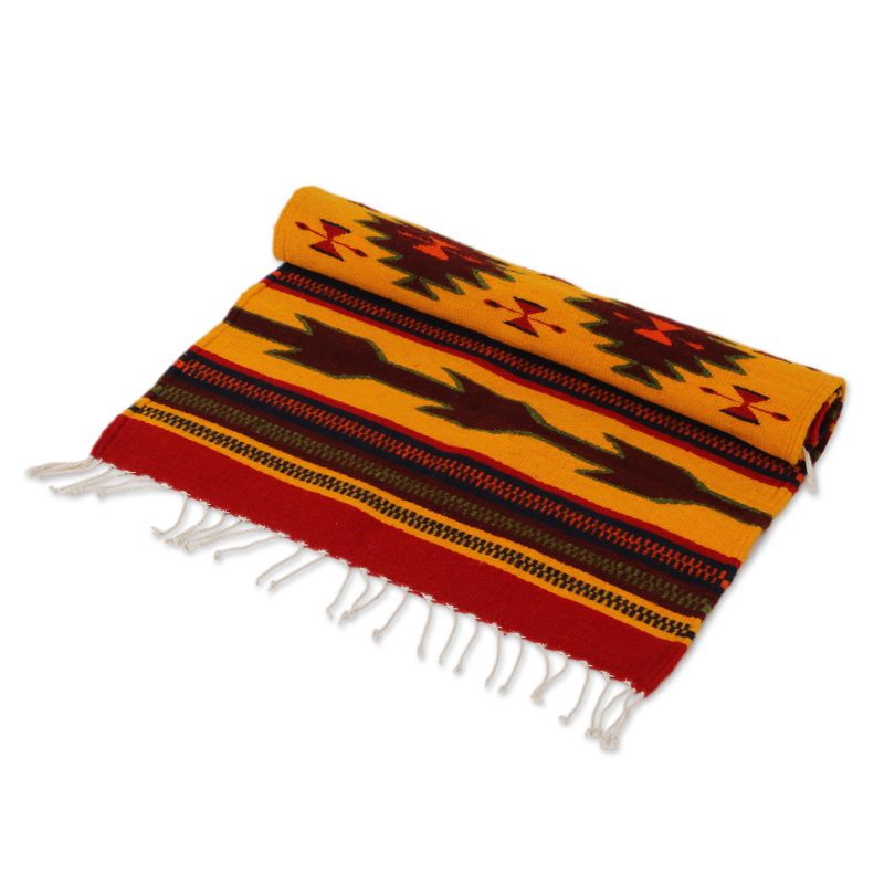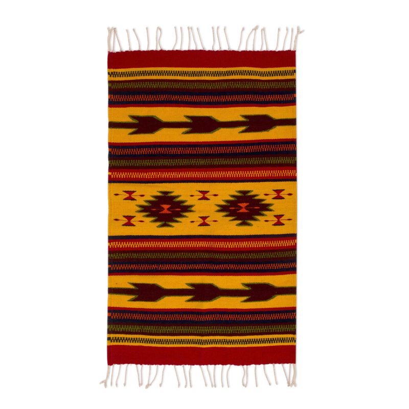 Backed by our 100% Happiness GuaranteeArrows streak across fields of glowing yellow as Mario Chávez weaves bold images in fiery colors. Surrounded by red stars, sunbursts inhabit the central field of this radiant design. The rug – named "Arpones" in Spanish – is hand-woven of virgin wool in Mexico's Zapotec tradition.