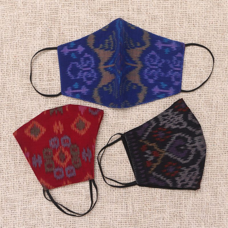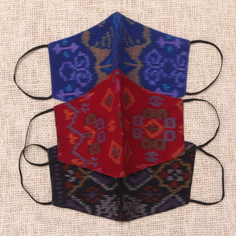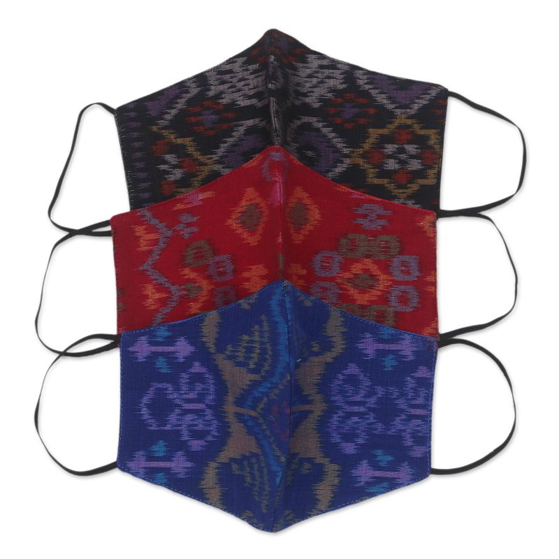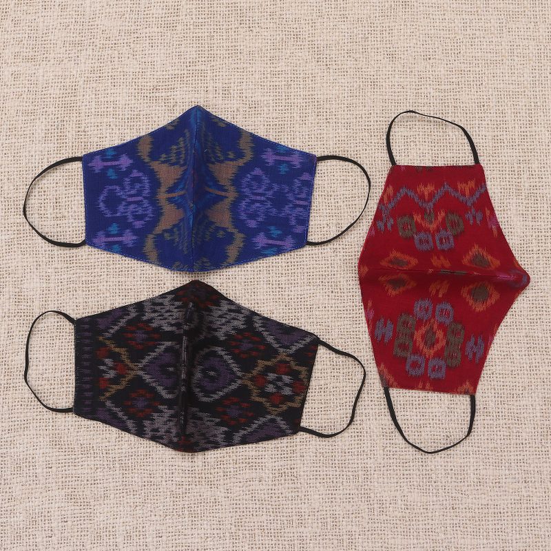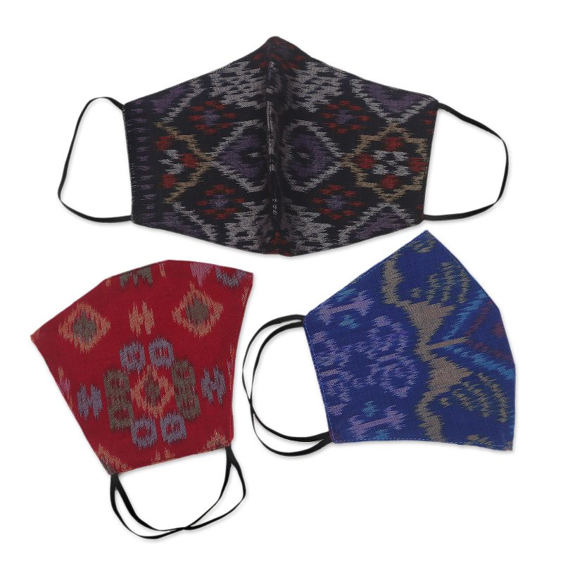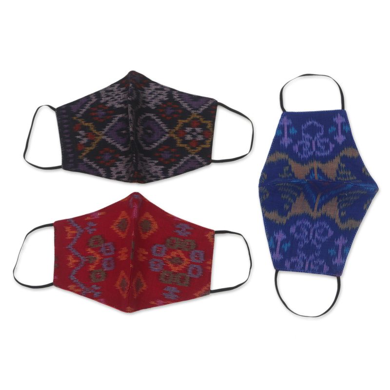 Rich burgundy, onyx black and sapphire blue bring dazzling jewel colors to cotton face masks. By Desak Nyoman Parwati, the set of three is created with the traditional ikat technique in which the threads are tie-dyed to create the motifs before they are woven by hand. All three masks are washable and reusable, and have loops to fit over the ears.