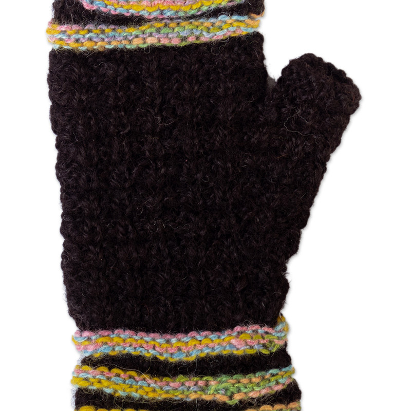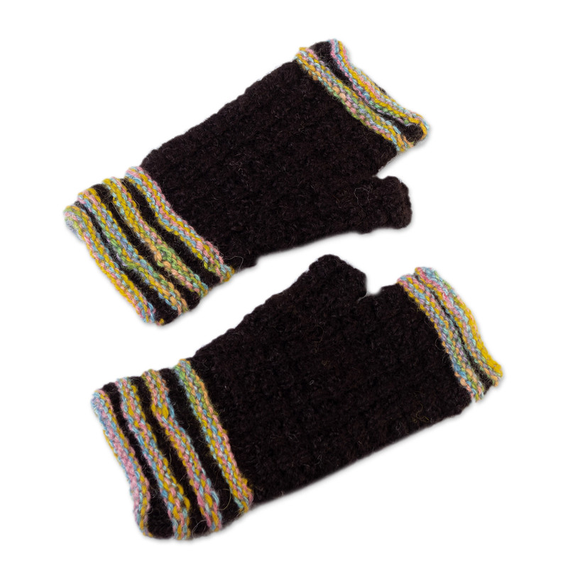 Classic black fingerless mitts get a touch of color with stripes on the top and bottom in this elegant design by Peru's Maria Esperanza Jauregui. These unisex winter accessories are knit from soft alpaca fibers to keep your hands warm at all times.