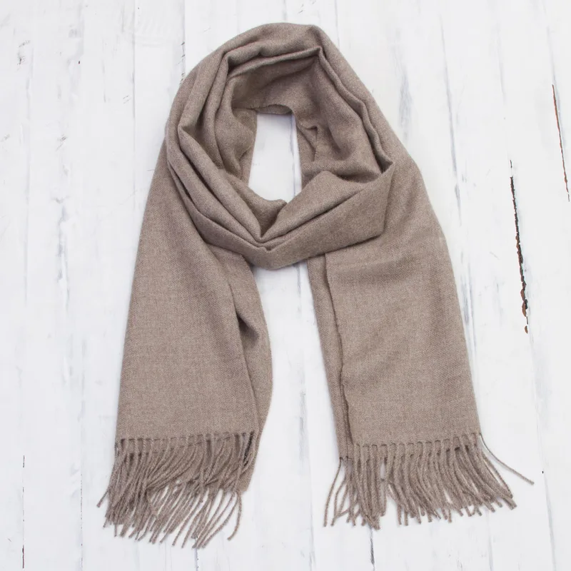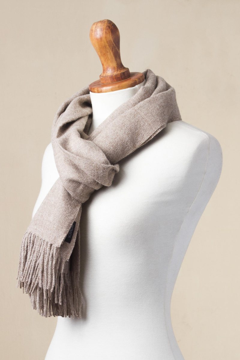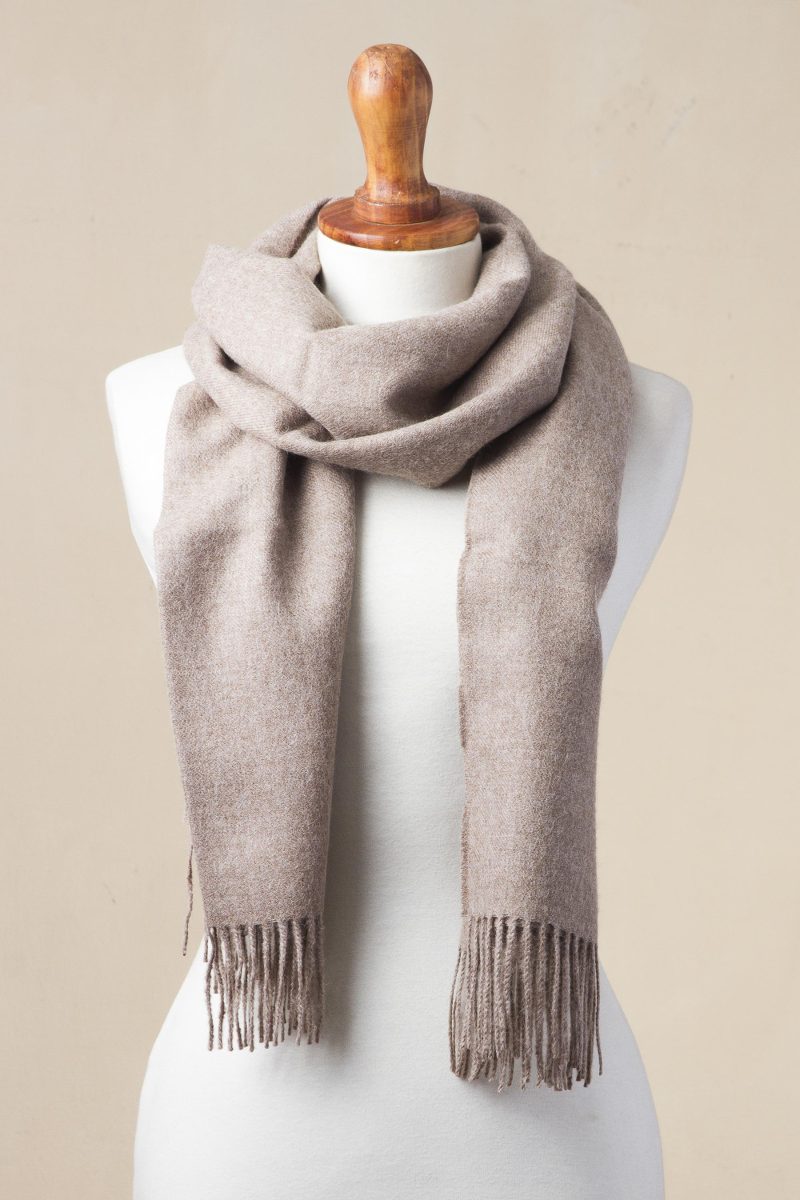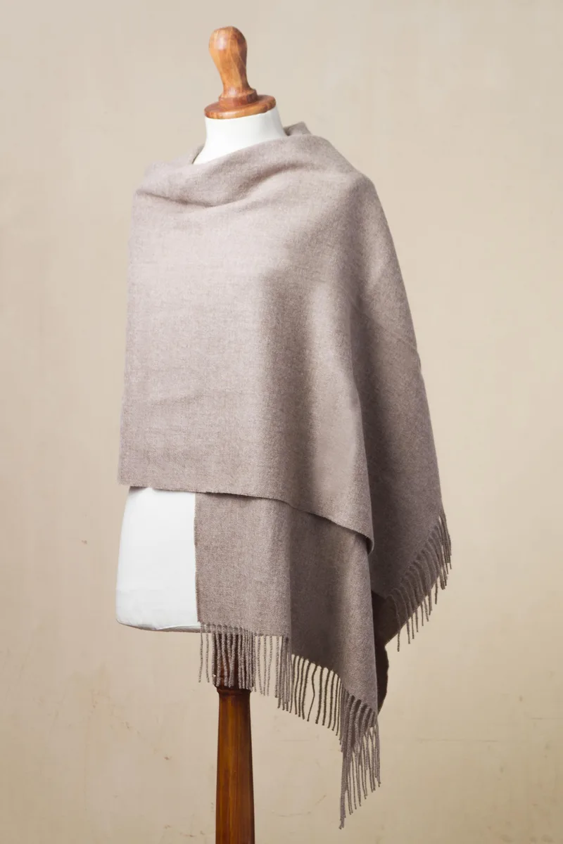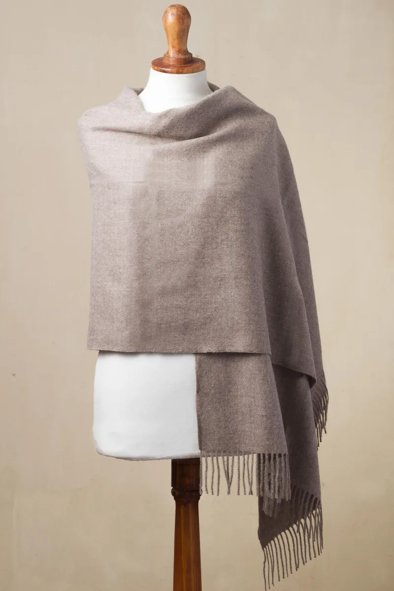 Simple in its design, yet stunning in its beauty, this authentic Peruvian shawl is sure to turn heads wherever it goes. Nataly and Alberto present an accessory for keeping warm during the cold moths. This shawl is woven from 100% baby alpaca wool in taupe with fringe accentuating the ends. Baby alpaca refers to the fine fleece from the season's first shearing. This shawl's width allows it to double as a wrap scarf.