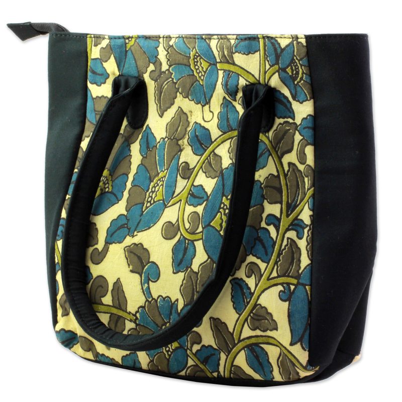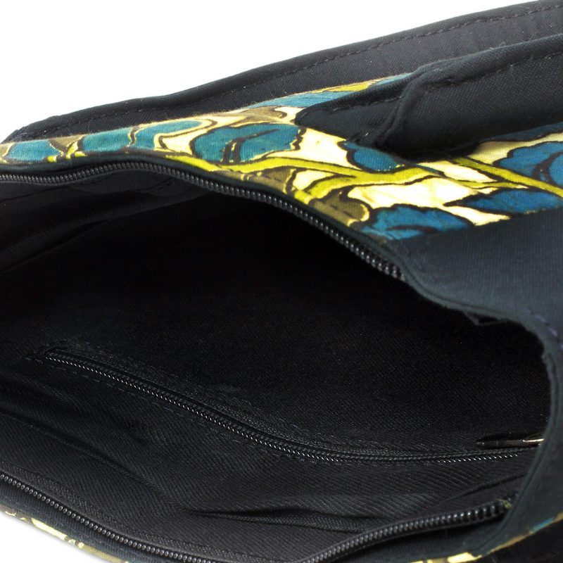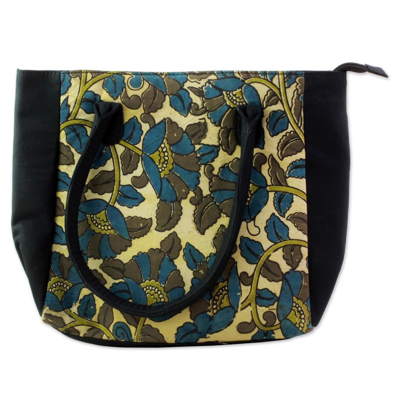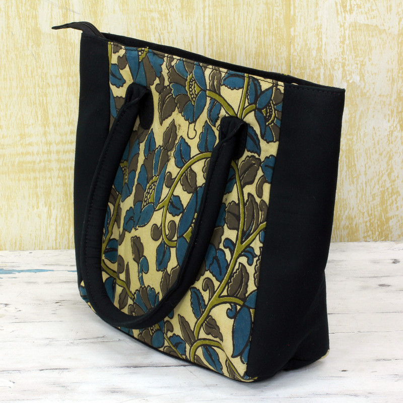 Floral motifs in olive and teal form an elegant thicket across a straw-colored body in this tote handbag, crafted from 100% cotton with black sides and straps. India's Rajnandinee and Srabonti apply the designs using the daboo, or mud batik method, where a mud resist is applied to the fabric before submerging it in vats of dye. The bag opens at the top with a zipper to reveal a black polyester lining with two open pockets and a single zipper pocket.