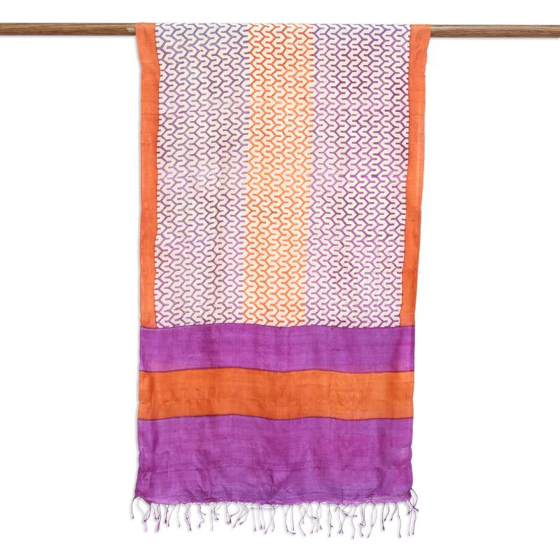 Each taught by her respective mother, Rajnandinee and Srabonti combine their talents and skills in the stunning design of this tussar silk shawl. Resembling beehives, the imagery is masterfully block printed on the shawl in a bold palette of colors that includes deep lavender and ginger over alabaster.