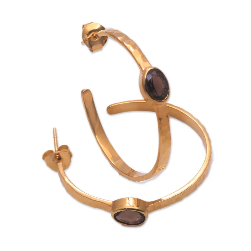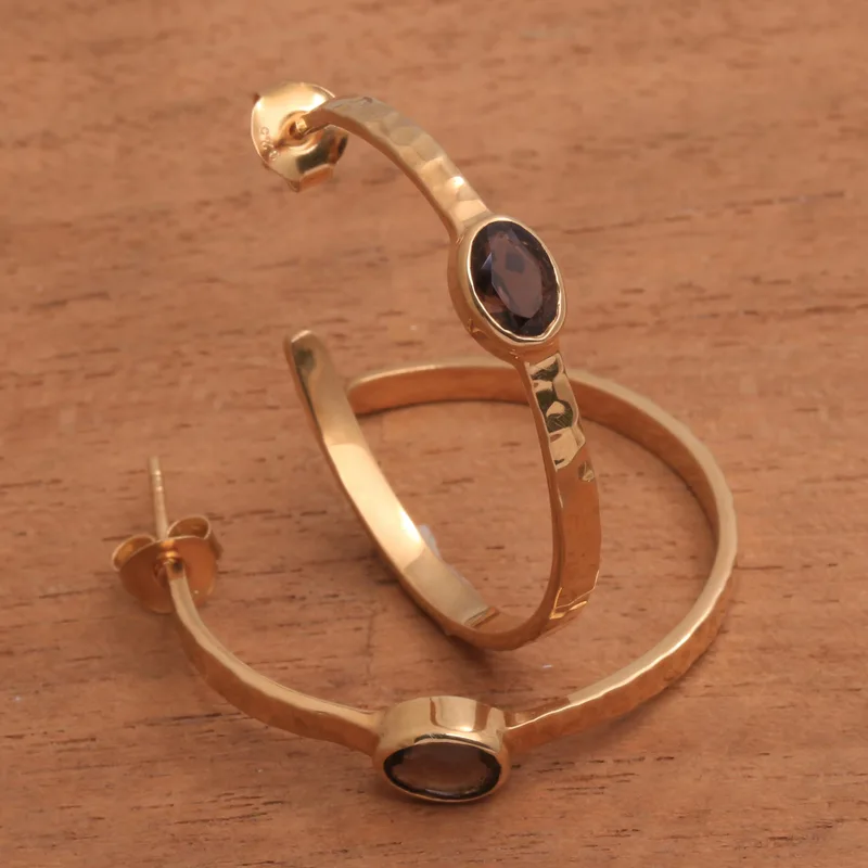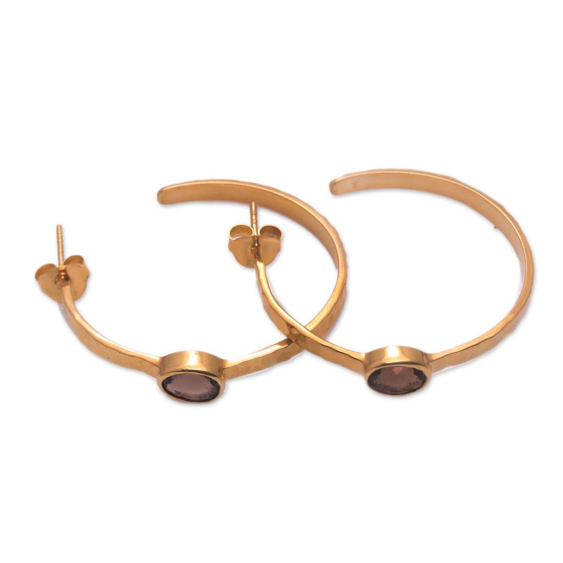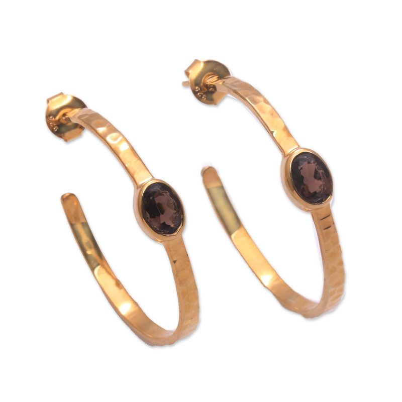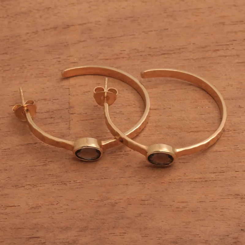 Indonesian artisan Nyoman Ariawan handcrafts a stunning pair of accessories to adorn your ears. Sterling silver half-hoops have been bathed in 18k gold, while also featuring a textured hammer finish. Two sparkling pools of smokey quartz contrast with the metallic elements.