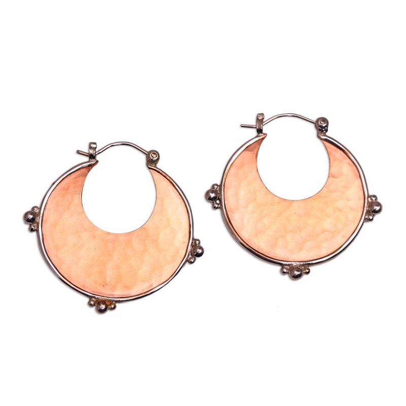 Possessing the utmost beauty, these hoop earrings by Nyoman Nartawan in Bali feature crescents that are handcrafted from copper plated in 18k rose gold. Given a hammered finish, the glistening crescents are framed by sterling silver with petite spheres.