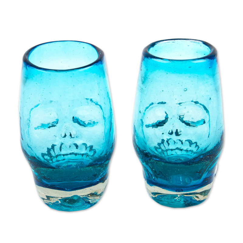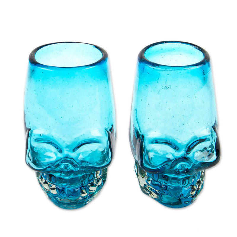 You can find our handblown recycled glass tequila glasses 'Aqua Mexican Skull' (pair) by Lourdes Martinez in tableware categories such as Handblown Drinkware, Glass Drinkware and Tequila Glasses Drinkware. Enjoy exploring these sections for other Novica treasures.