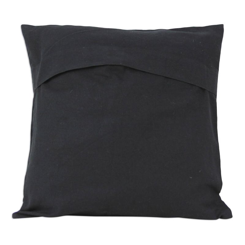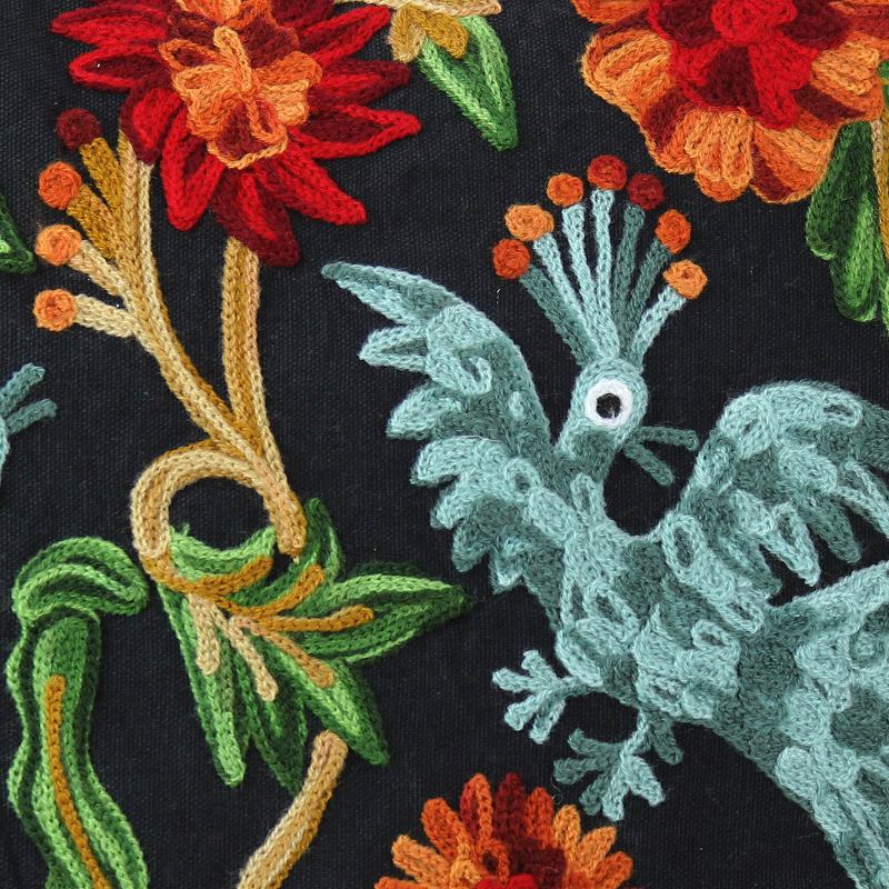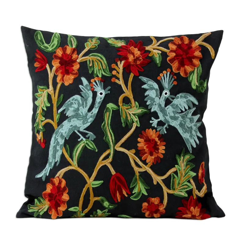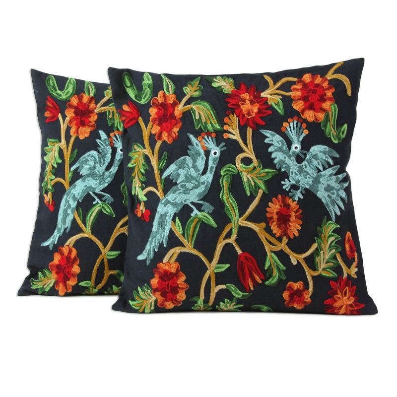Blue cockatoos flit amid crimson flowers on midnight black. Lavishly machine-embroidered, each image is created with the aari chainstitch technique. These dramatic cushion covers are designed by Amit Moza. A slit opening at the back permits insertion of the cushions, and the reverse side is solid black.