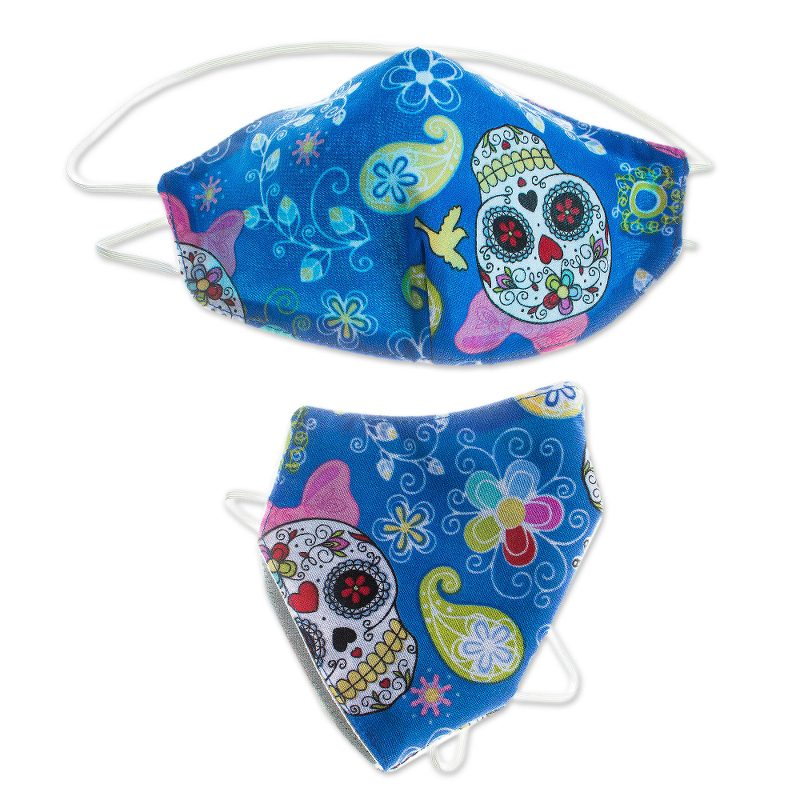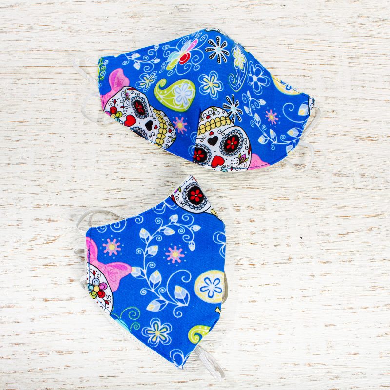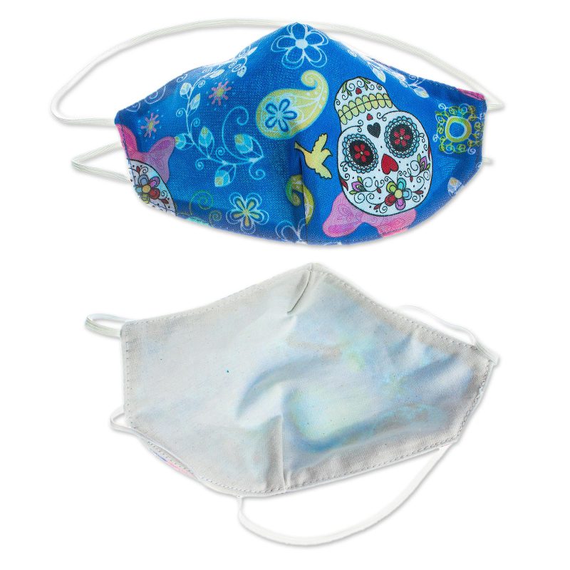 Floral skeletons wearing flirty bows grace these charming face masks by Maria Cristina Martinez. Crafted of a blue polyester print, they are lined in cotton, are washable and reusable, and feature elastic that stretches completely around the head.