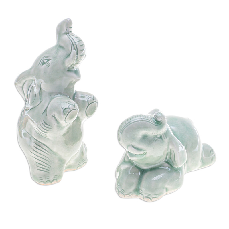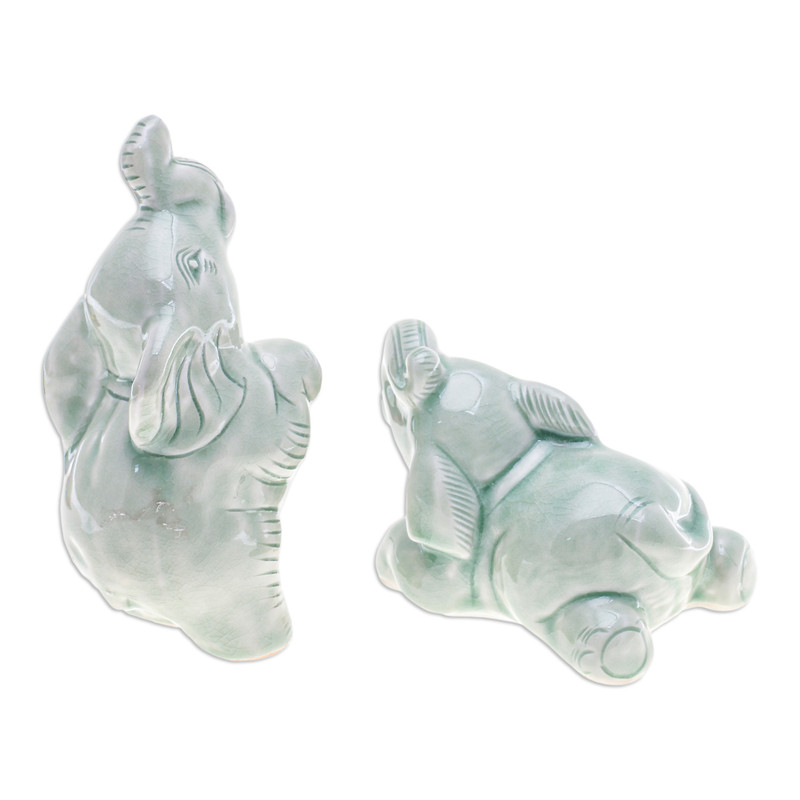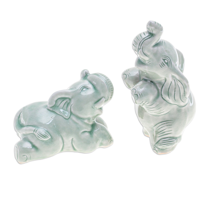 Amidst a symphony of exultant trumpets, two jubilant elephants reach their trunks skyward with boundless joy. Thai artisan Kanda meticulously handcrafts these mesmerizing green figurines with the ancient technique of celadon ceramics, infusing each creation with an enchanting crackled texture that captivates the eye. Whether gracefully seated or gallantly standing, these delightful elephants emanate an irresistible aura of contagious mirth.