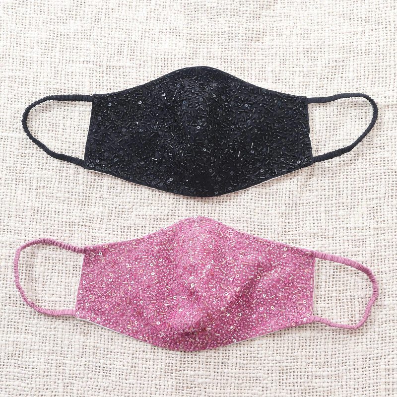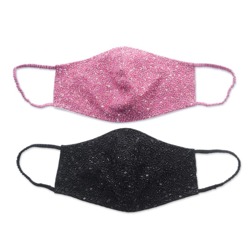 Backed by our 100% Happiness GuaranteeBeautiful hand-beadwork in black on black and pink on pink bring glamour to face masks by Made Suciati. The contoured pair is crafted of three layers of cotton and feature elastic loops covered in cotton for comfort. They are washable and reusable.