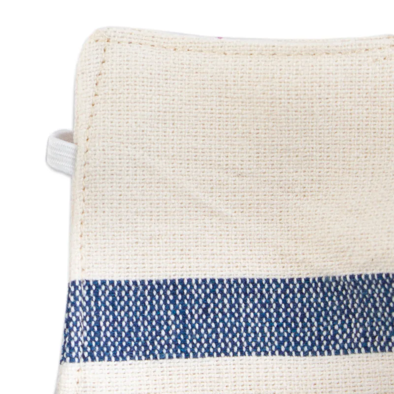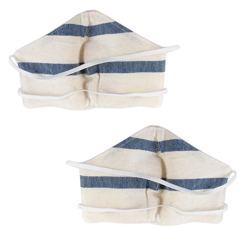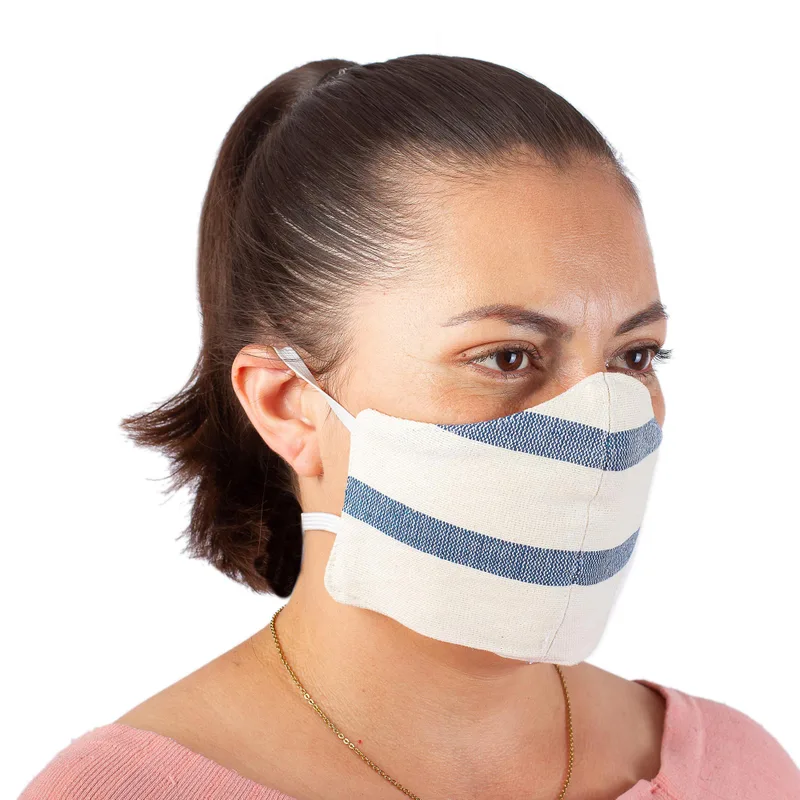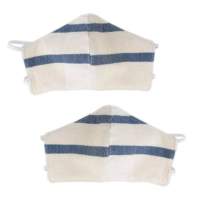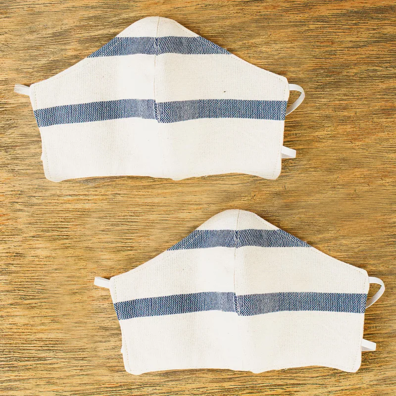 Quiet yet classic, blue stripes flow across an ivory background. Cool cotton is woven on a backstrap to become an attractive pair of face masks with unique handwoven textures. Artisans from Creative Hands of Oaxaca craft the contoured masks with elastic bands to stretch around the head. They are double-layered and are both washable and reusable.