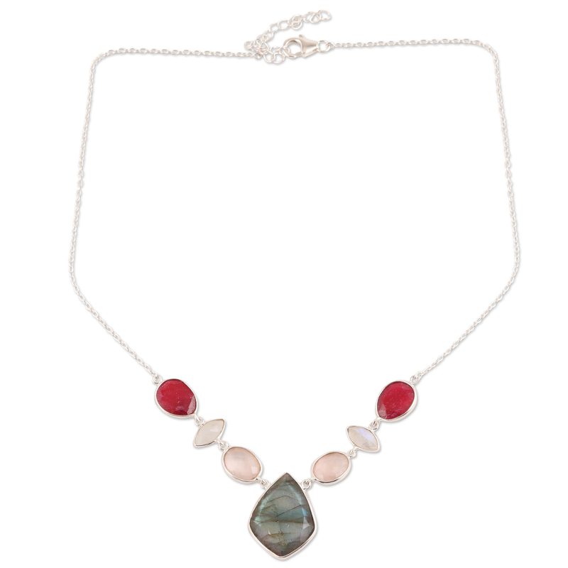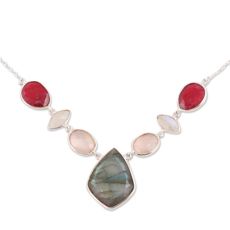 Faceted rose quartz, rainbow moonstone, and ruby flank a kite-shaped labradorite stone. Designed by Neetu Barathi, this Indian pendant necklace is crafted from sterling silver and set with gemstones totaling more than 21 carats.