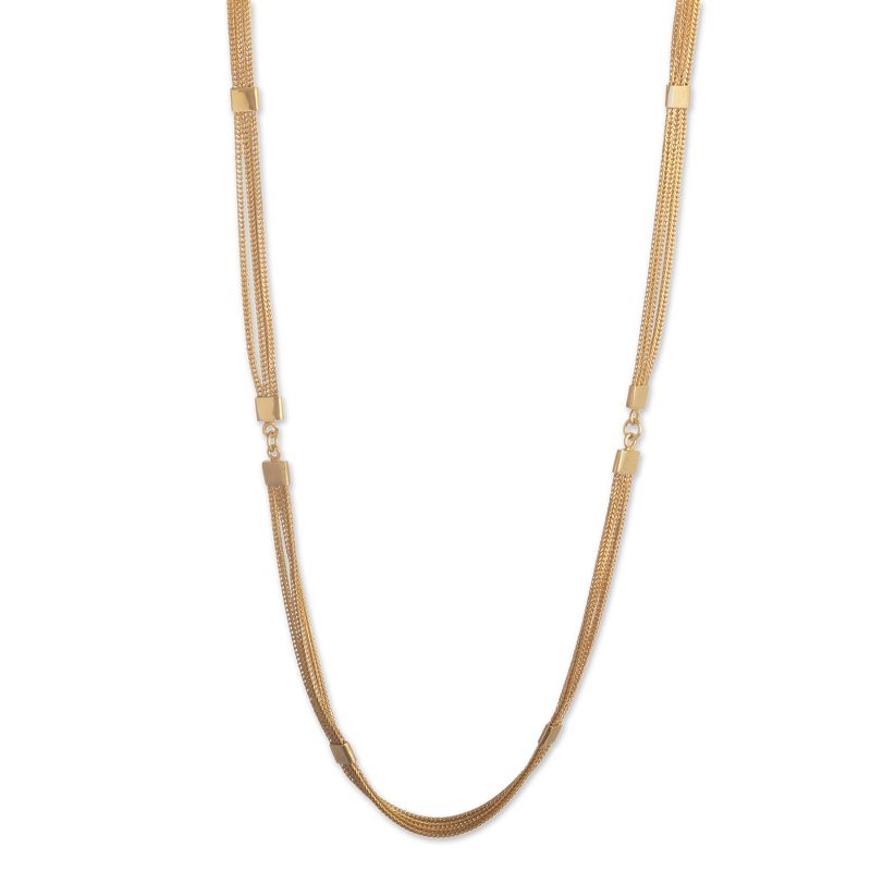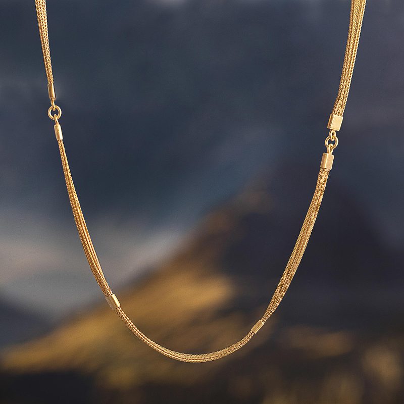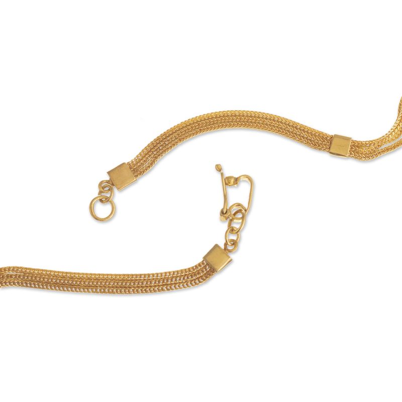 In the modern world, elegance comes from simple, yet highly considered designs. Such is the case with this 3-chain necklace in 21K gold plating over sterling silver, intermittently bound together with bands and/or links. The design is the creation of Giuliana Valz-Gen of Lima, Peru.