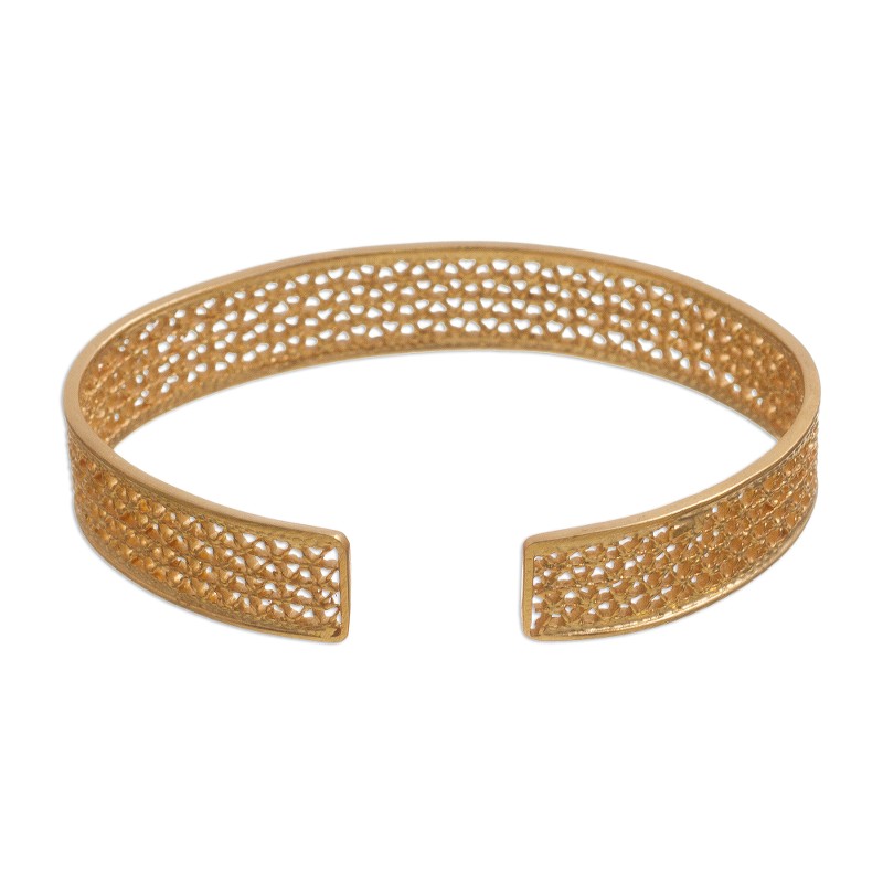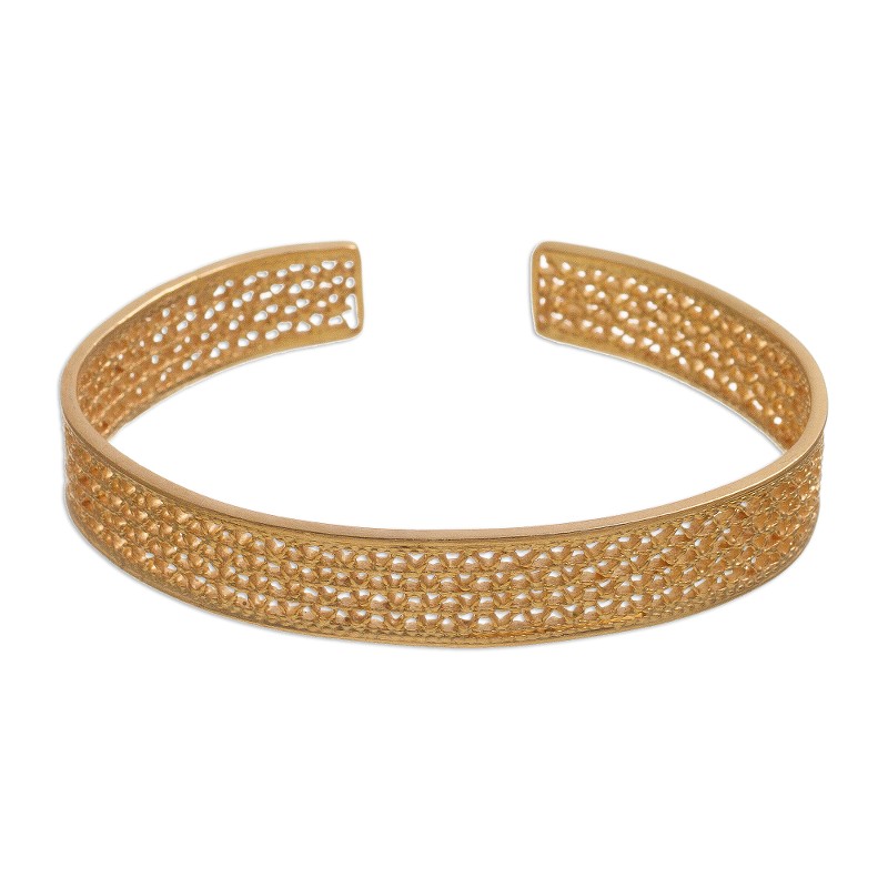 You can find our gold-plated sterling silver filigree cuff bracelet 'Shining Elegance' by Giuliana Valz-Gen in jewelry categories such as Modern Bracelets, No Stone Bracelets, Gold Bracelets, Gold Plated Bracelets and Cuff Bracelets. Enjoy exploring these sections for other Novica treasures.