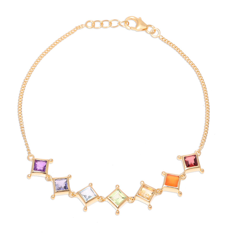 A colorful gemstone grid aligns with chakra energies to achieve a harmonious sense of well-being. From Alok Jain in India, this 22k gold plated sterling silver link bracelet glistens with amethyst, iolite, citrine, peridot, garnet, blue topaz, and carnelian. Their colors correspond to a specific chakra. Clear and light purple stones are associated with the seventh chakra (awareness and wisdom); the purple, violet and indigo gems with sixth chakra (insight and perception), and the blue or light blue with the fifth, that of communication and truth. Green and pink stones are for love and compassion, linked to the heart, on the fourth chakra. For inner power and will, the third chakra is associated with yellow gems, whereas emotion and sexuality are linked to red and orange gems for the second chakra. Black gems are used to stimulate the first chakra, that of stability and security.