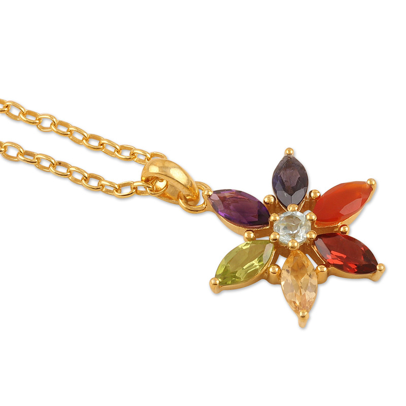 Backed by our 100% Happiness GuaranteePresented by Alok Jain, a gorgeous bloom dangles from a 22k gold-plated structure, part of this pendant necklace crafted by Indian artisans. Using garnet, carnelian, citrine, peridot, iolite and amethyst stones in a marquise cut, the artisans bring the stunning floral detail to life, polishing everything for a radiant look. As the final touch, a round blue topaz gem adds an ethereal vibe to the accessory, which totals over three carats.