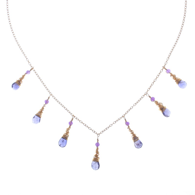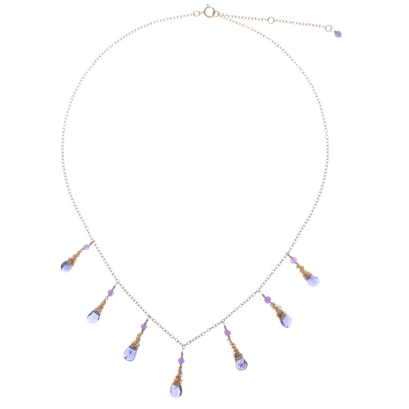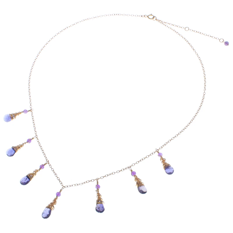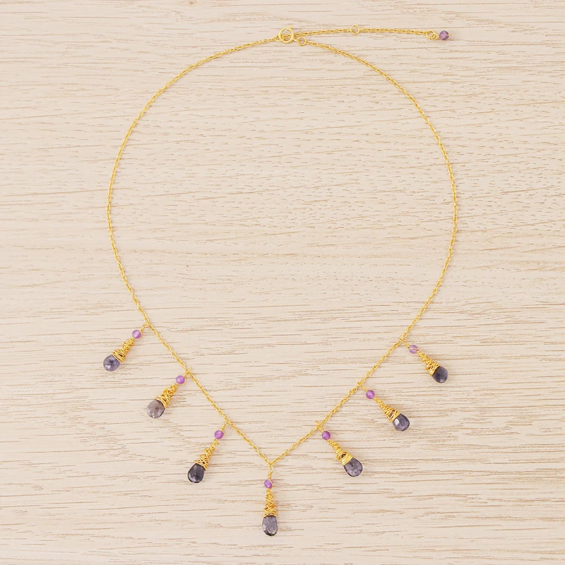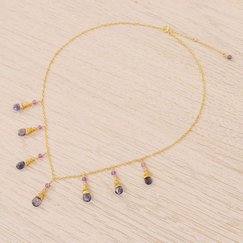 Backed by our 100% Happiness GuaranteeIndulge in the fascinating allure of this heavenly waterfall necklace, an opulent essential that leaves an unforgettable mark. Designed by Thai artisan Somsiri Juntamin and meticulously crafted with 24k gold plating, it boasts the mesmerizing beauty of dreamy iolite and amethyst gemstones. Adorned with intricate twisted wire accents, it radiates an elegant polished finish. Complete with an adjustable extender chain, this luxurious accessory ensures a perfect fit, tailored to your personal style.