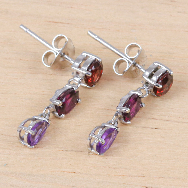 Sweet colors add a celestial touch to a design inspired by spring colors. Thai artisan Roongnapa has a long experience working with precious gemstones, which allows her to create these sterling silver dangle earrings totaling four carats, with their main elements being stunning jewels in a faceted style. Including round garnet stones, oval rhodochrosite gems, and pear-shaped amethyst jewels, the design evokes a luxurious aura enhanced by a high polish finish that makes it the perfect complement to a gala or sophisticated event.