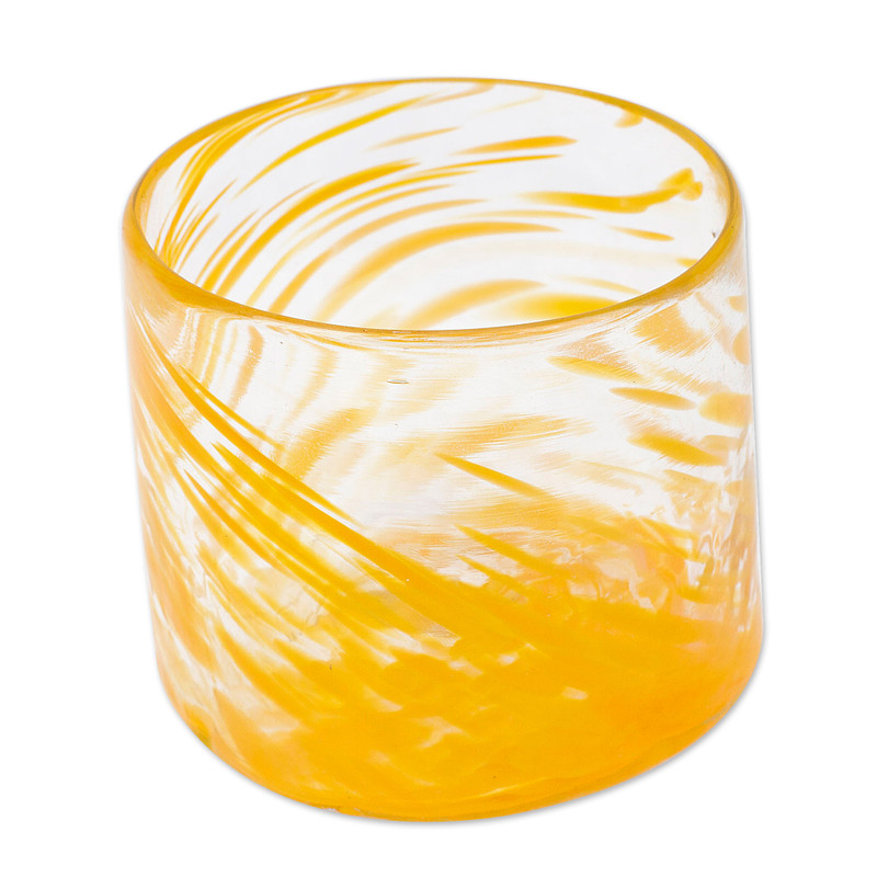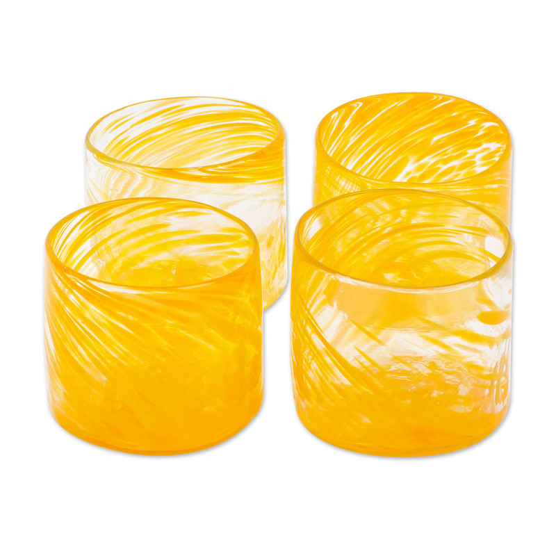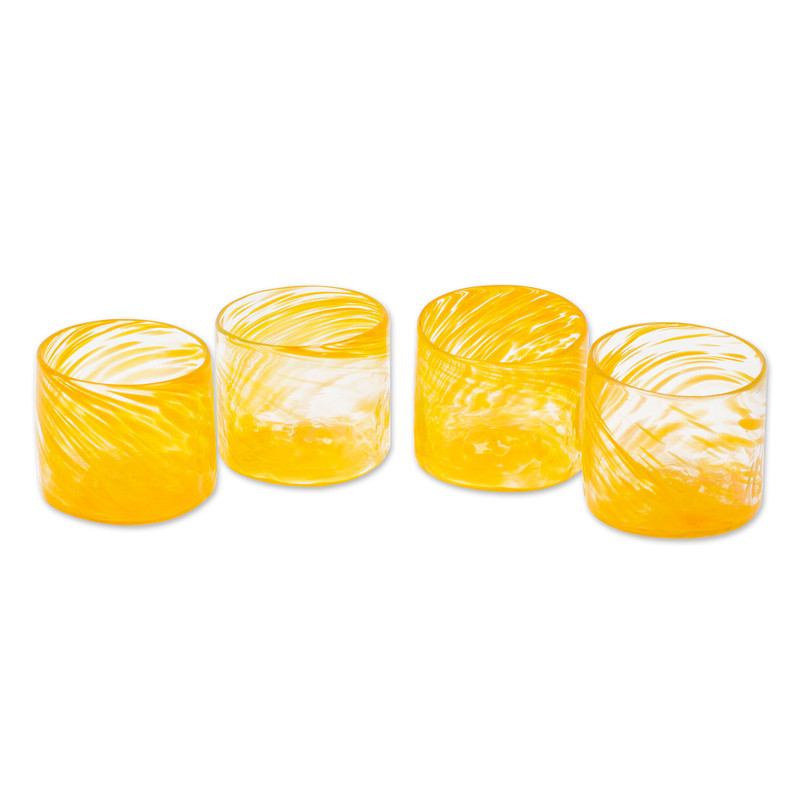 Backed by our 100% Happiness GuaranteeSalime Cruces finds inspiration in the breathtaking textures, colors and shapes of nature, translating them into stunning hand-blown glass designs. Her dedication to environmental conservation is evident in her use of recycled glass and reliance on alternative energy sources like solar panels and recycled cooking oil for kiln firing. The Mexican artisan presents a set of four juice glasses hand-blown from recycled glass and infused with vibrant orange pigments, promising to leave a lasting impression on your dinner party guests.