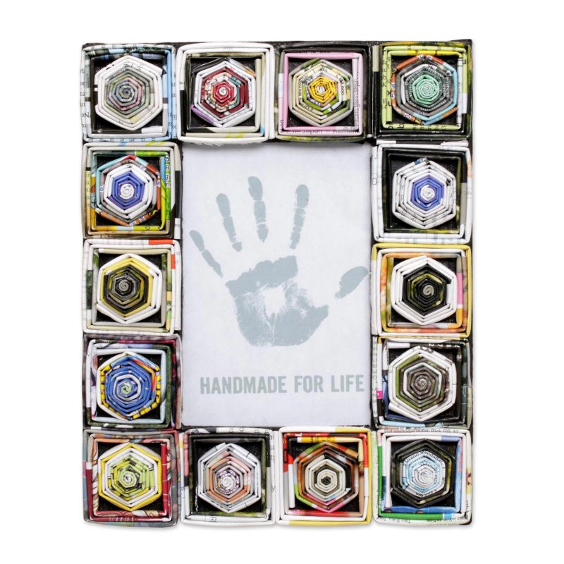 Square temples of tightly-wound recycled magazine and newspaper are crafted by hand, surrounding a glass pane in this rectangular photo frame. India's Riris Simanjuntak designs the photo frame for an eco-friendly addition to any home.