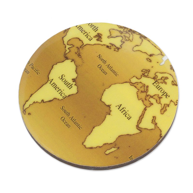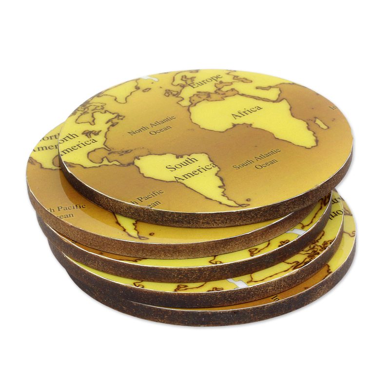 Backed by our 100% Happiness GuaranteeCrafted from wood by Indian artisans, this set of five coasters is presented by Kamal, inviting you to rest your drinks in worldly style. A map of the world in brown and yellow is laminated on the surface of each round coaster.