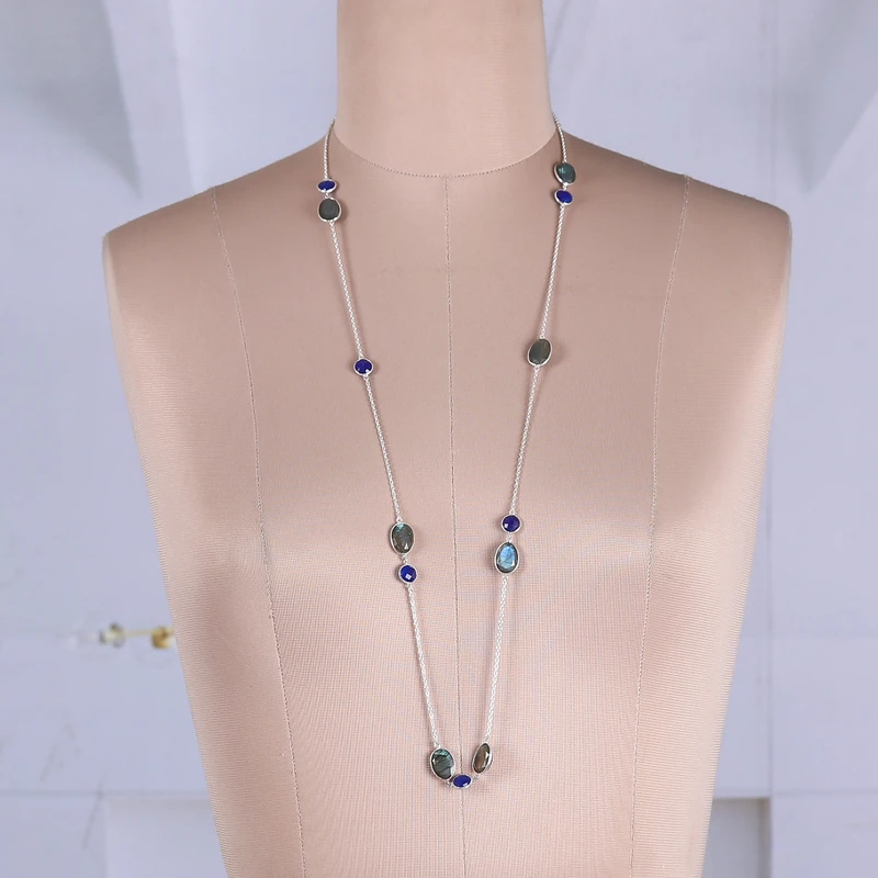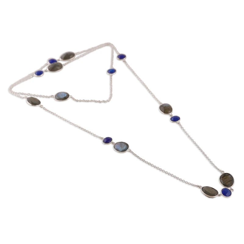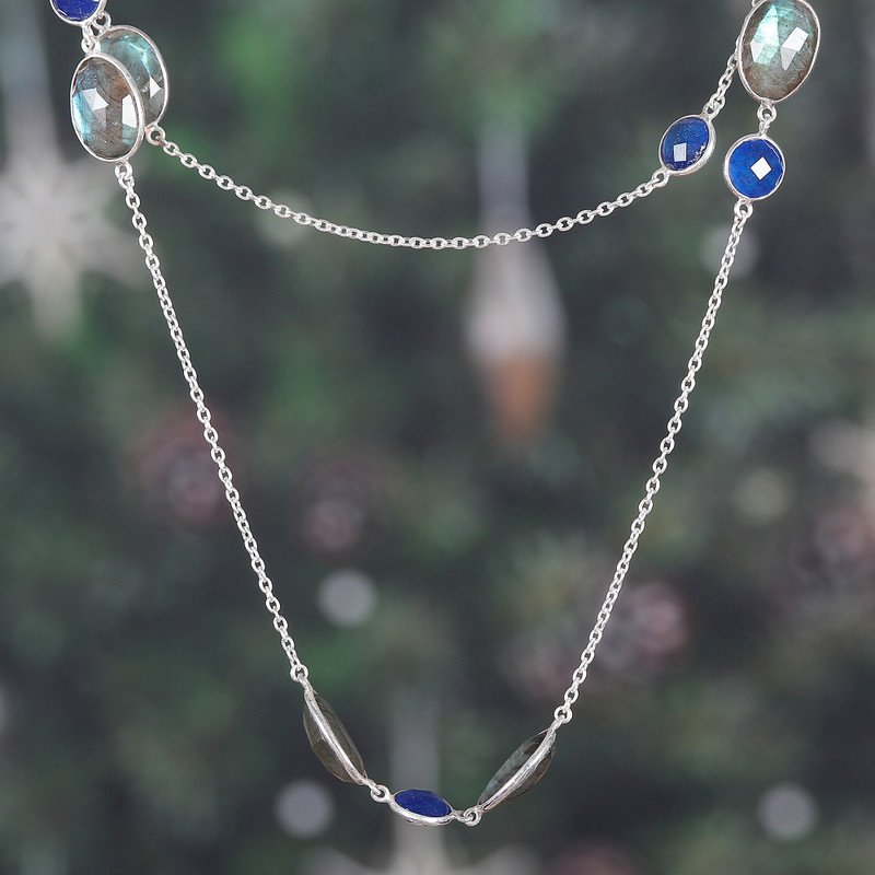 Accent your ensembles with elegance—mystic blue elegance! Designer Neetu Barathi of India combines exquisite labradorite colors with blue quartz jewels in this station necklace, totaling sixty carats of luxurious beauty. To allow for a unique look, Neetu and her team cut the faceted gems in a checkerboard shape, letting their enigmatic light spread around a sterling silver chain.