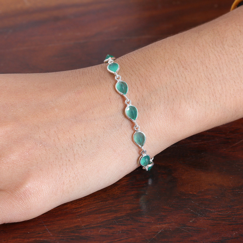 Energies of intellect, strength and discipline are attracted by the faceted onyx gems arranged in this superb creation presented by Bhavesh. Indian artisans, experts in jewelry and metalworking techniques, craft this enchanting link bracelet from sterling silver in a polished finish that enriches each of the green jewels, totaling nine carats.