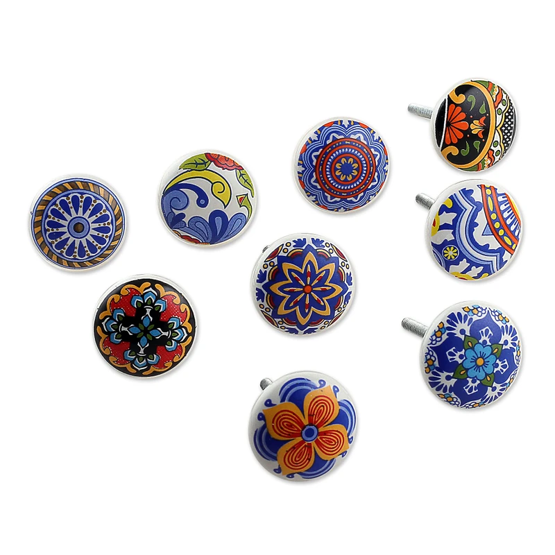 Backed by our Happiness GuaranteeElevate your space with this set of nine charming ceramic knobs from Chirag Choudhary, adorned with vibrant hand-painted motifs that promise to infuse your surroundings with energy and style. Crafted by skilled Indian artisans using oven-fired clay, each knob boasts intricate detailing and effortless installation with iron and nickel-plated iron fixtures.