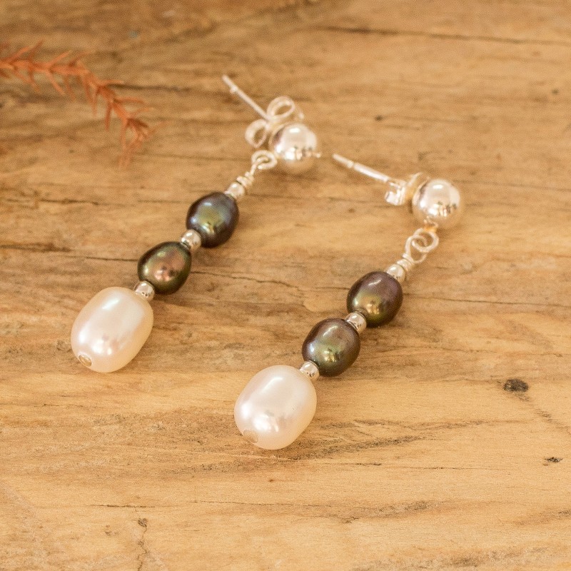 Backed by our 100% Happiness GuaranteeThis exquisite pair of dangle earrings pays homage to the timeless allure and opulence of classic two-tone pearl designs. With lustrous sterling silver posts, the elegant and sophisticated earrings from Costa Rica's Miriam Bruten boast a total of four natural grey cultured pearls and two natural cream cultured pearls.