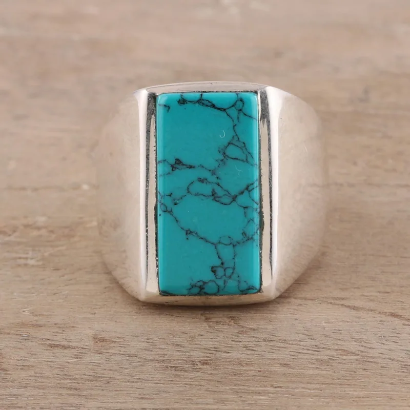 Both bold and intriguing, this men's ring is presented by India's Alok Jain. Handcrafted by local artisans, the ring features a piece of reconstituted turquoise laid within its sterling silver setting. The gallant, high-polished sterling silver band adds style to the design, making it a unique ring for the modern man.