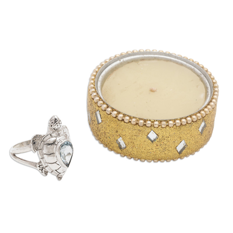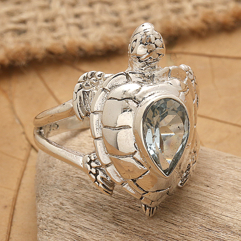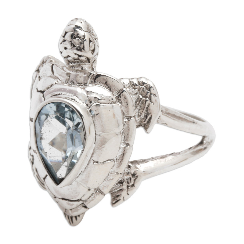 Regarded as the wisest of souls in the animal kingdom, the turtle inspires this fabulous ring from Made Sudiari. The ring is handcrafted of sterling silver and crowned with a realistic depiction of the turtle and its heart-shaped shell. Blue topaz, gem of empathy, completes this beautiful design - perfect for the collector of animal-themed jewelry.